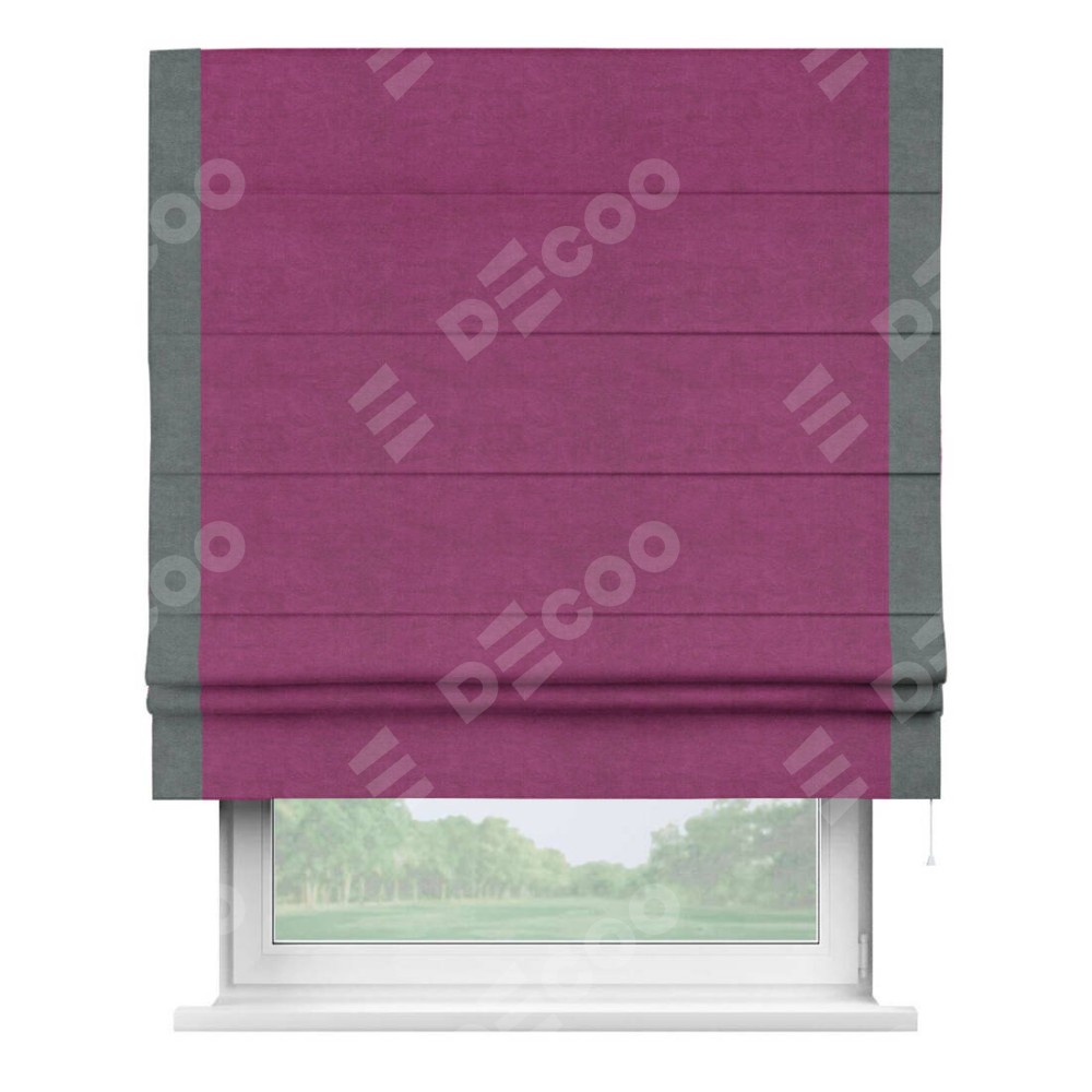 Римская штора производителя «Cortin», используется для проёма, пошита из ткани вельвет фиолетовый, артикул ткани 85552. Отделка шторы кантом «Стрим Дуо», ткань для канта используется из вельвета разной расцветки на выбор. Имеет универсальный механизм и подходит для монтажа: на потолок, на стену и в нишу.