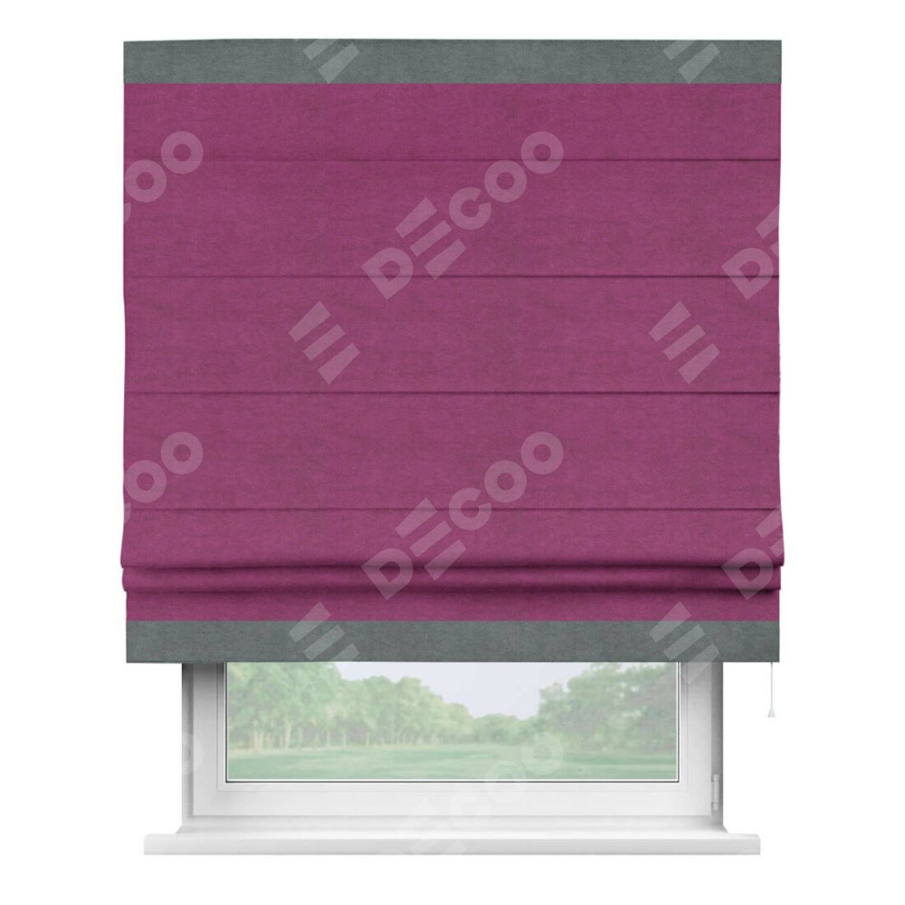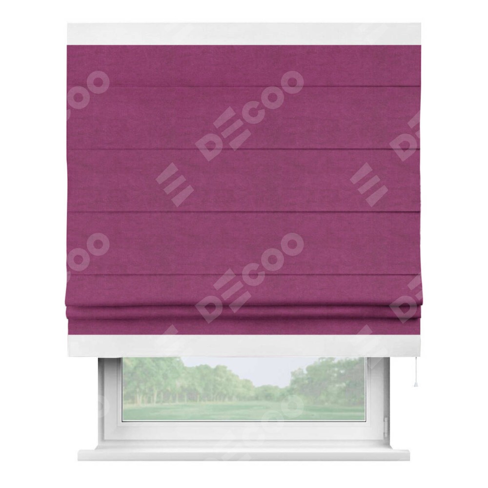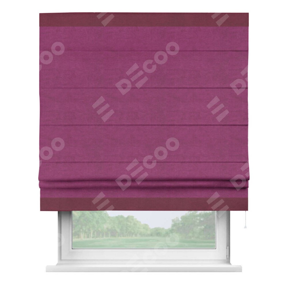 Римская штора производителя «Cortin», используется для проёма, пошита из ткани вельвет фиолетовый, артикул ткани 85552. Отделка шторы кантом «Горизонт», ткань для канта используется из вельвета разной расцветки на выбор. Имеет универсальный механизм и подходит для монтажа: на потолок, на стену и в нишу.