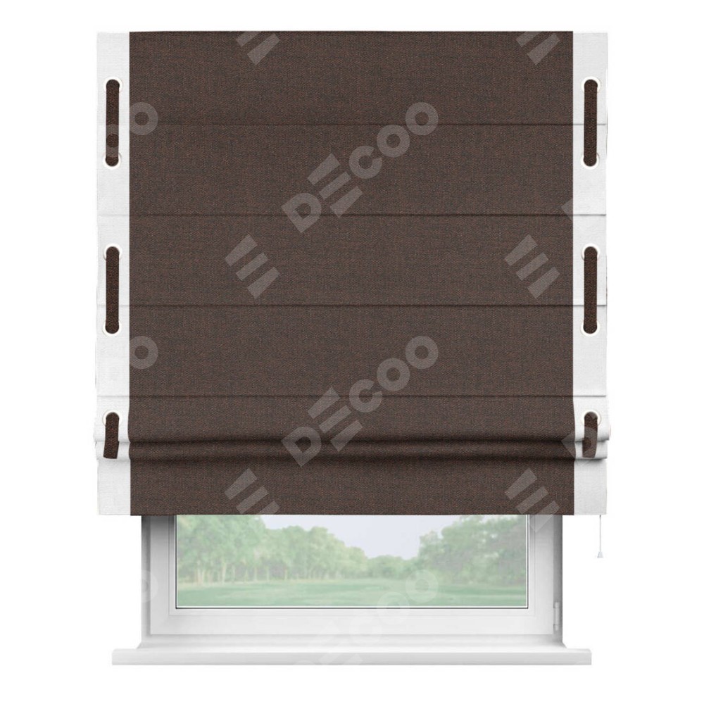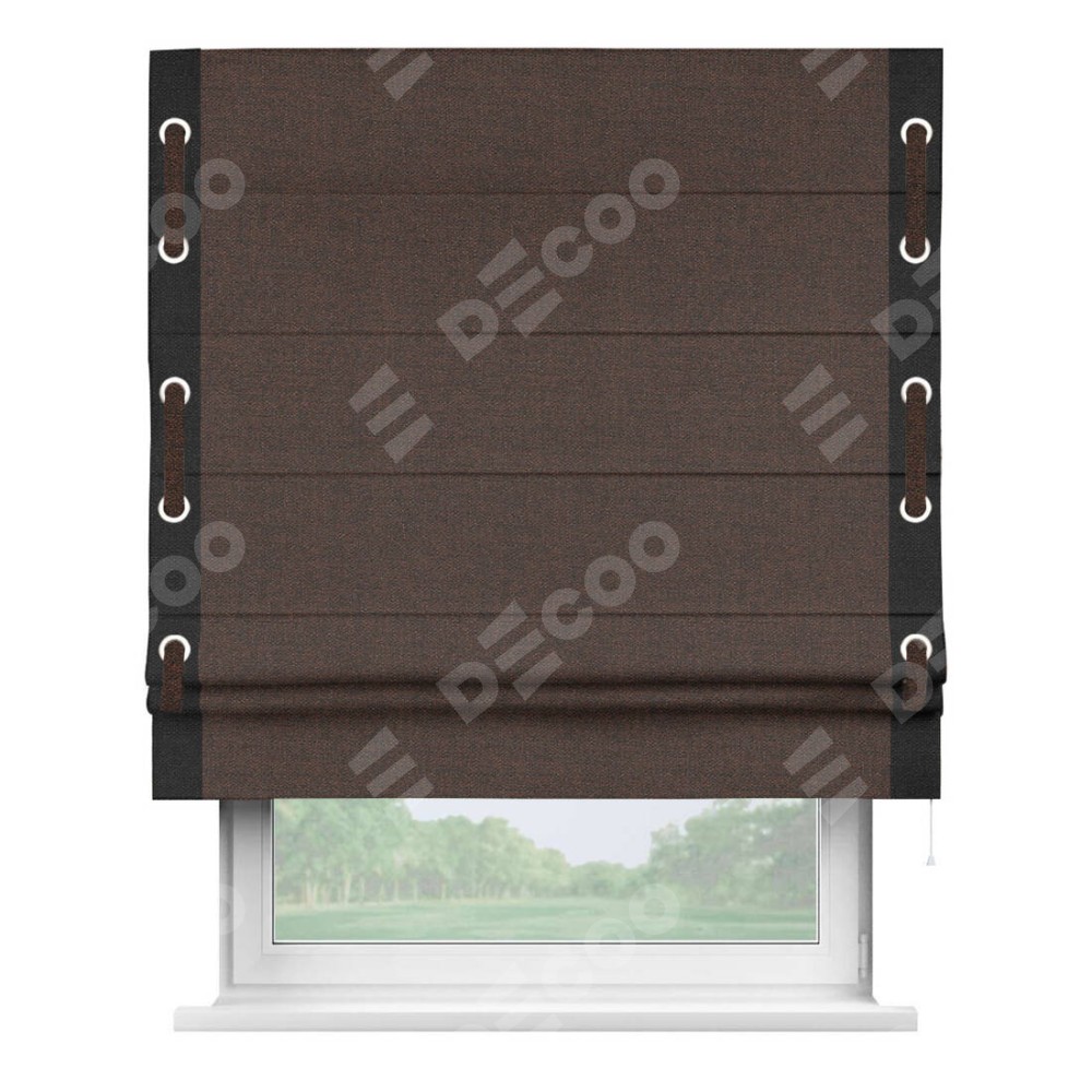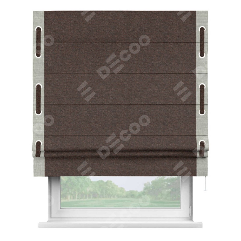 Римская штора производителя «Cortin», используется для проёма, пошита из ткани лён коричневый, артикул 53443. Отделка шторы кантом «Стрим Дуо» на кантах расположены люверсы с пояском, ткань для канта используется из льна разной расцветки на выбор. Ткань для пояска обычно используется из основной ткани шторы, а так же можно сделать из любой расцветки по желанию. Имеет универсальный механизм и подходит для монтажа: на потолок, на стену и в нишу.