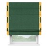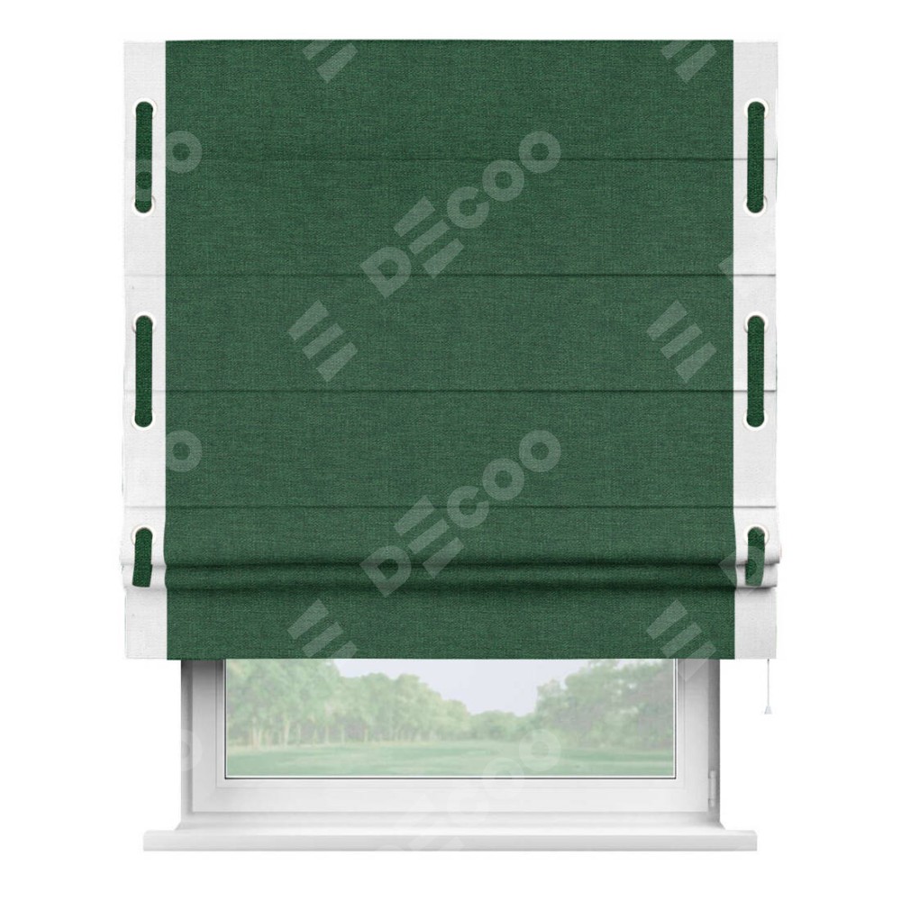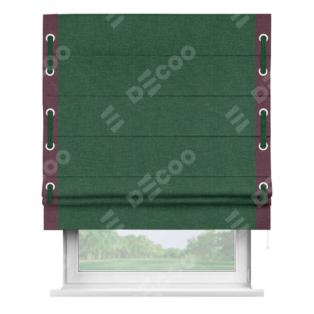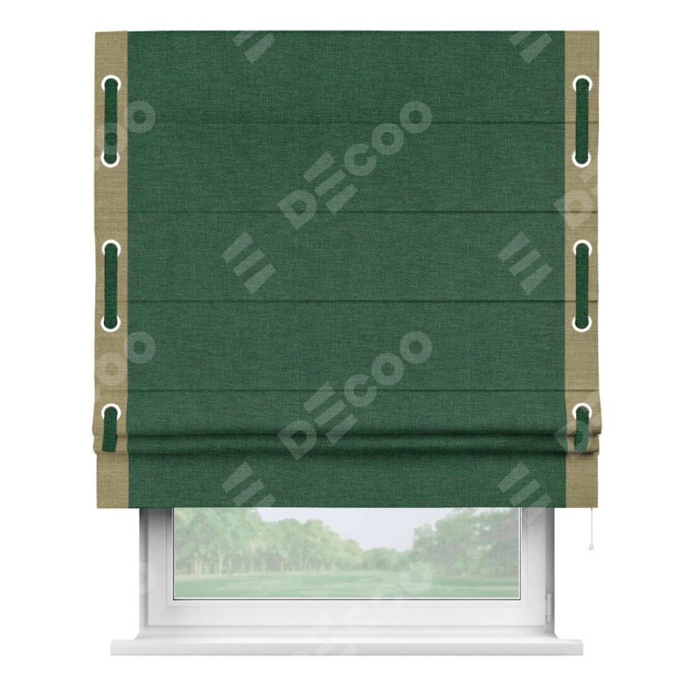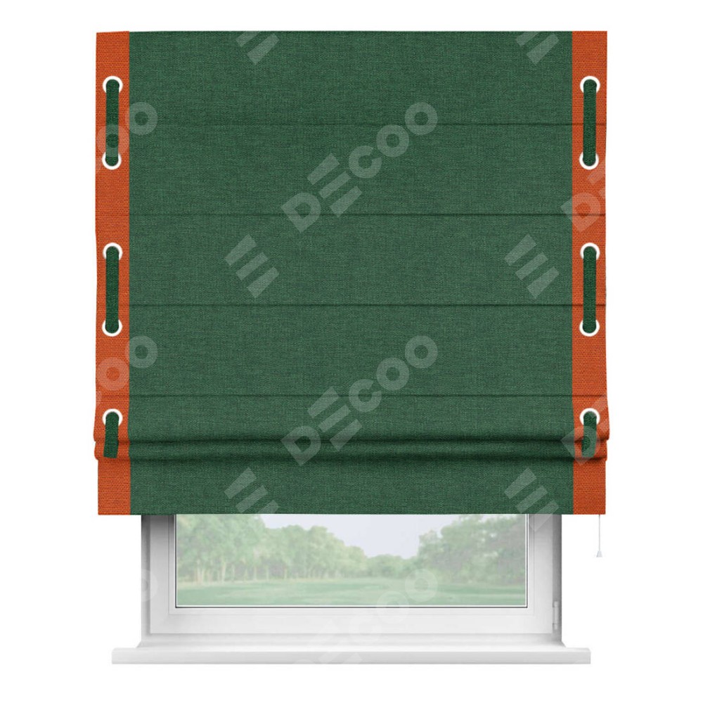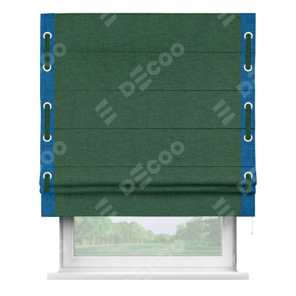 Римская штора производителя «Cortin», используется для проёма, пошита из ткани лён серо-зеленый, артикул 63740. Отделка шторы кантом «Стрим Дуо» на кантах расположены люверсы с пояском, ткань для канта используется из льна разной расцветки на выбор. Ткань для пояска обычно используется из основной ткани шторы, а так же можно сделать из любой расцветки по желанию. Имеет универсальный механизм и подходит для монтажа: на потолок, на стену и в нишу.