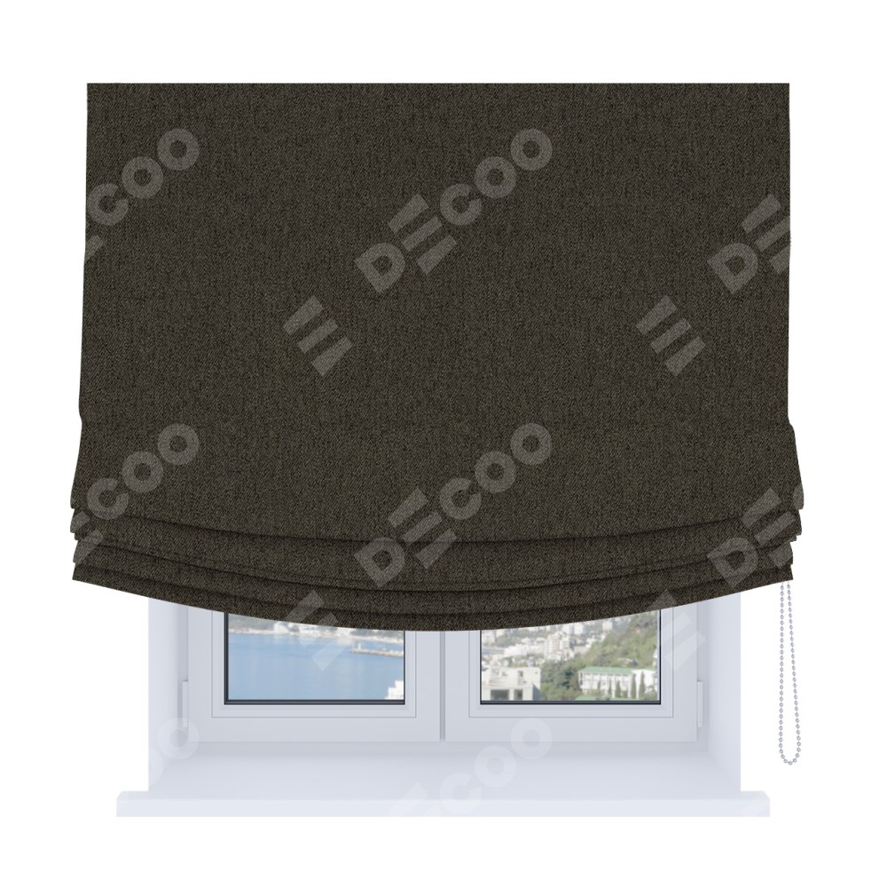 Римская штора Soft производителя «Cortin», используется для проёма, пошита из ткани твид блэкаут тёмно-коричневый, артикул ткани 21584. Имеет универсальный механизм и подходит для монтажа: на потолок, на стену и в нишу. В отличие от стандартных римских штор, римская штора Soft не имеет горизонтальных вставок и нижнего отвеса. Это позволяет ткани произвольно драпироваться в свободные мягкие складки.