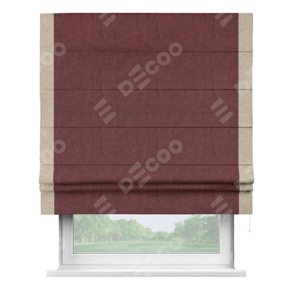 Римская штора производителя «Cortin», используется для проёма, пошита из ткани лён кашемир бордовый, артикул 17213. Отделка шторы кантом «Стрим Дуо», ткань для канта используется из льна разной расцветки на выбор. Имеет универсальный механизм и подходит для монтажа: на потолок, на стену и в нишу.