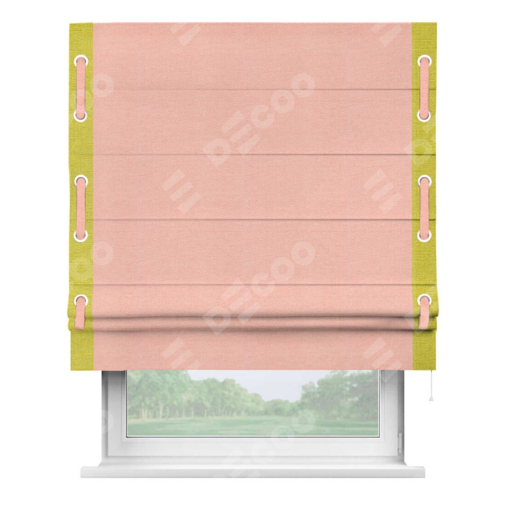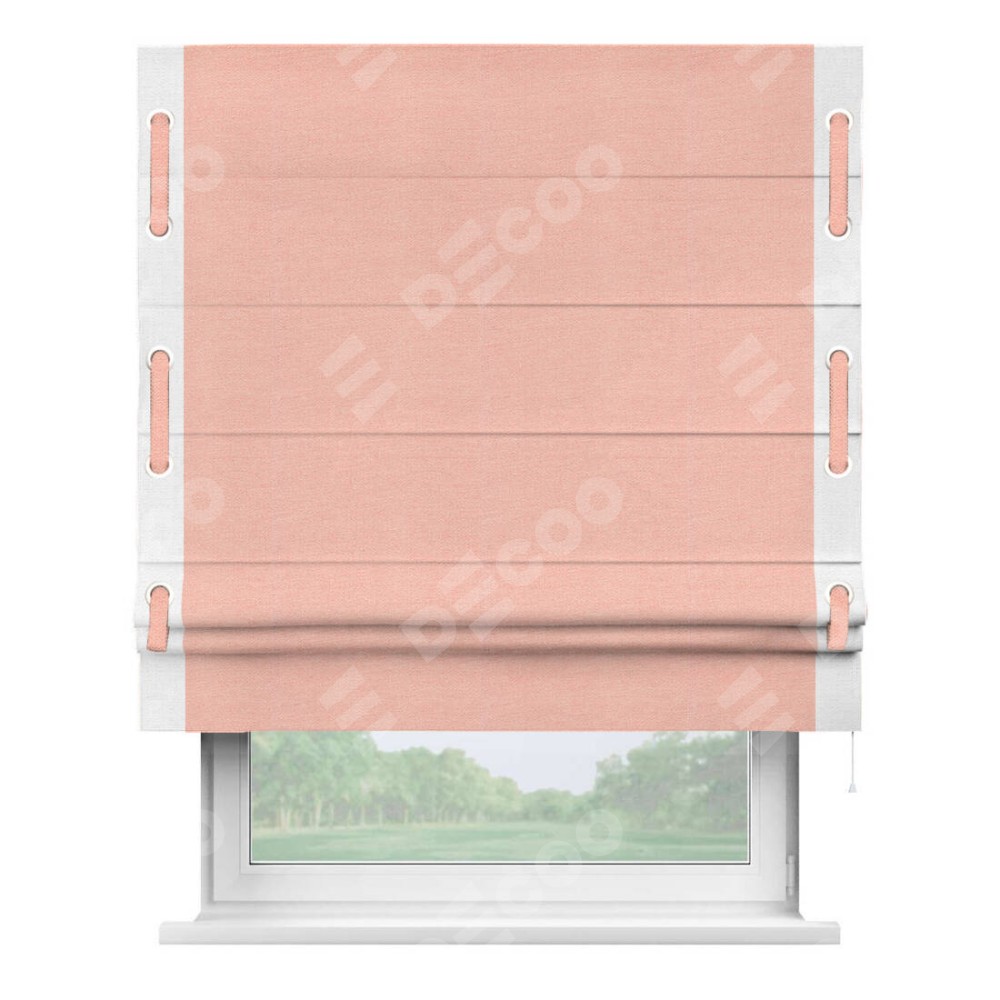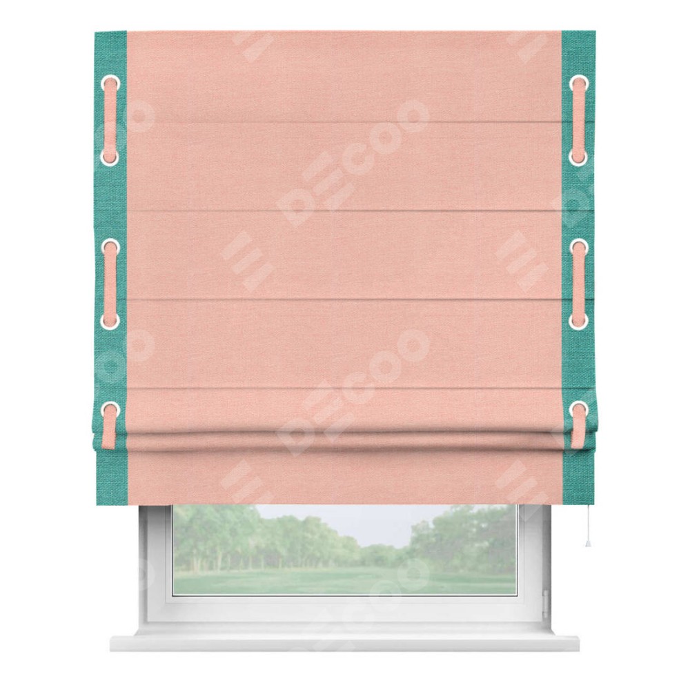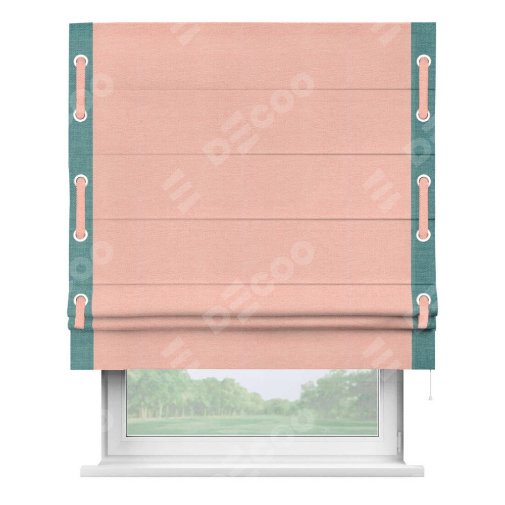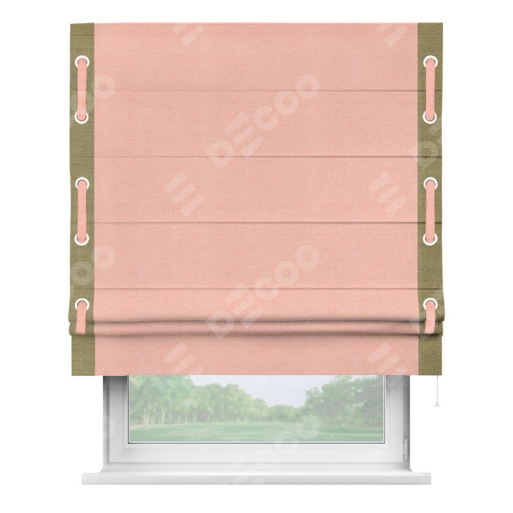 Римская штора производителя «Cortin», используется для проёма, пошита из ткани лён розовый, артикул 00005. Отделка шторы кантом «Стрим Дуо» на кантах расположены люверсы с пояском, ткань для канта используется из льна разной расцветки на выбор. Ткань для пояска обычно используется из основной ткани шторы, а так же можно сделать из любой расцветки по желанию. Имеет универсальный механизм и подходит для монтажа: на потолок, на стену и в нишу.