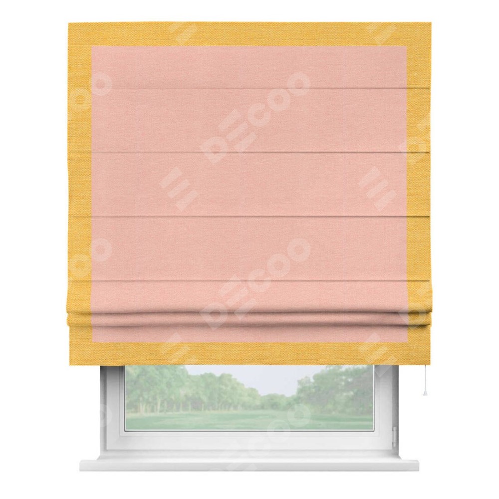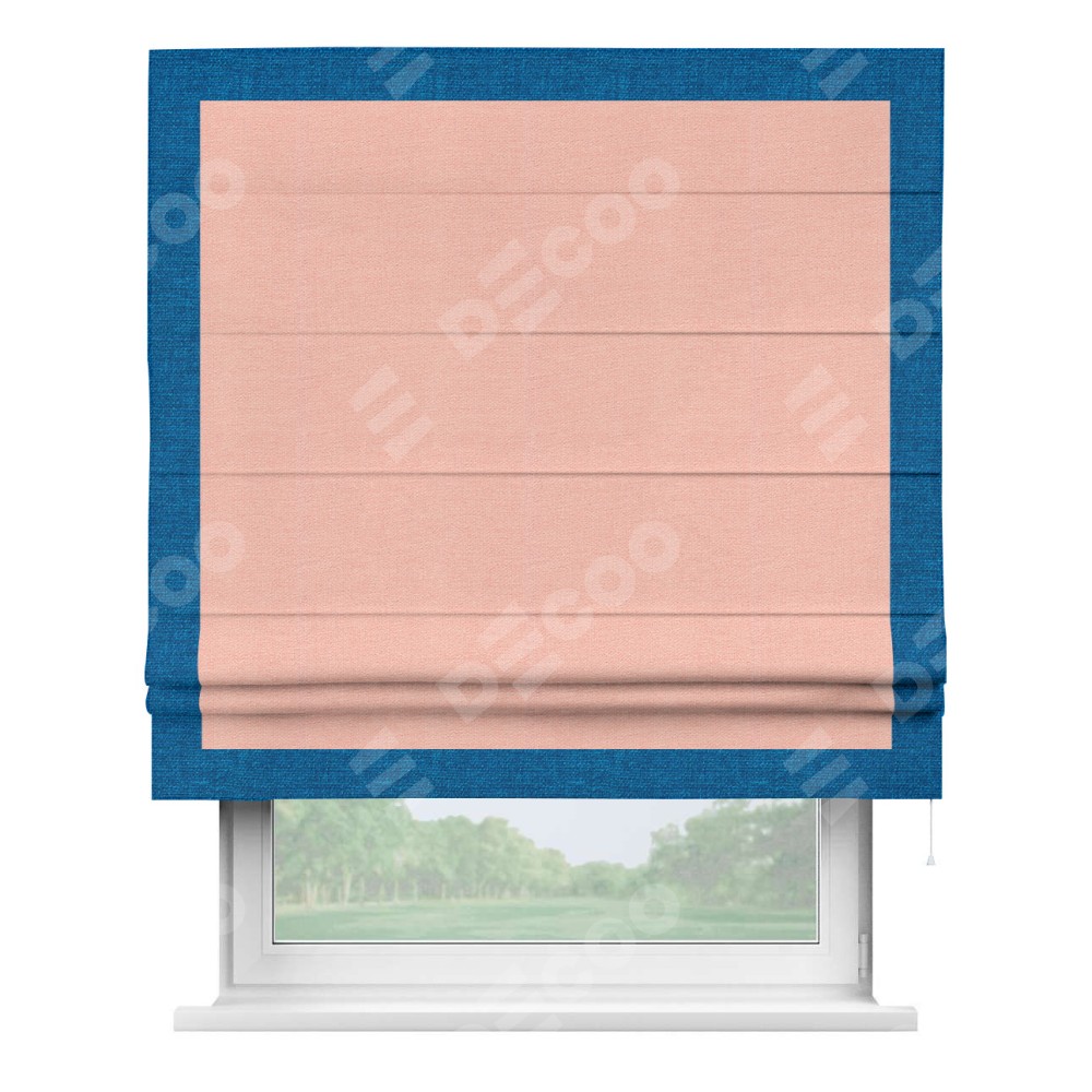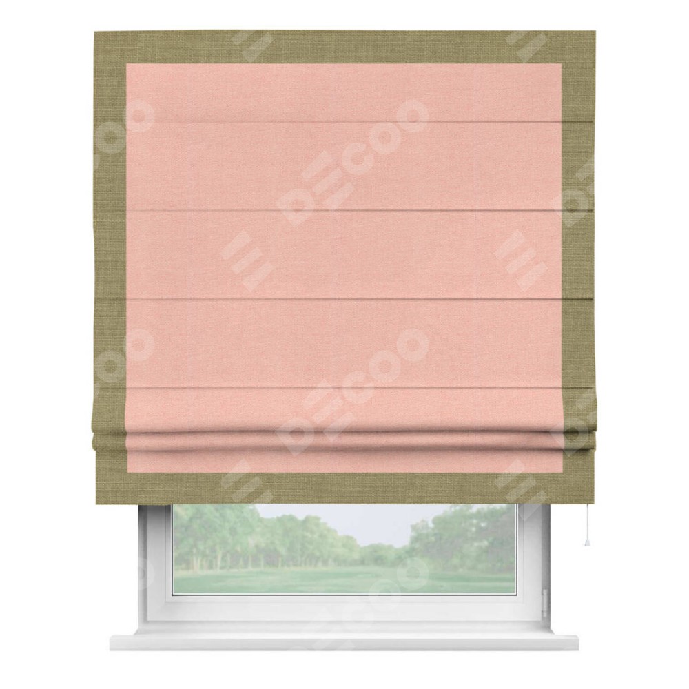 Римская штора производителя «Cortin», используется для проёма, пошита из ткани лён розовый, артикул 00005. Отделка шторы кантом «Чесс», ткань для канта используется из льна разной расцветки на выбор. Имеет универсальный механизм и подходит для монтажа: на потолок, на стену и в нишу.