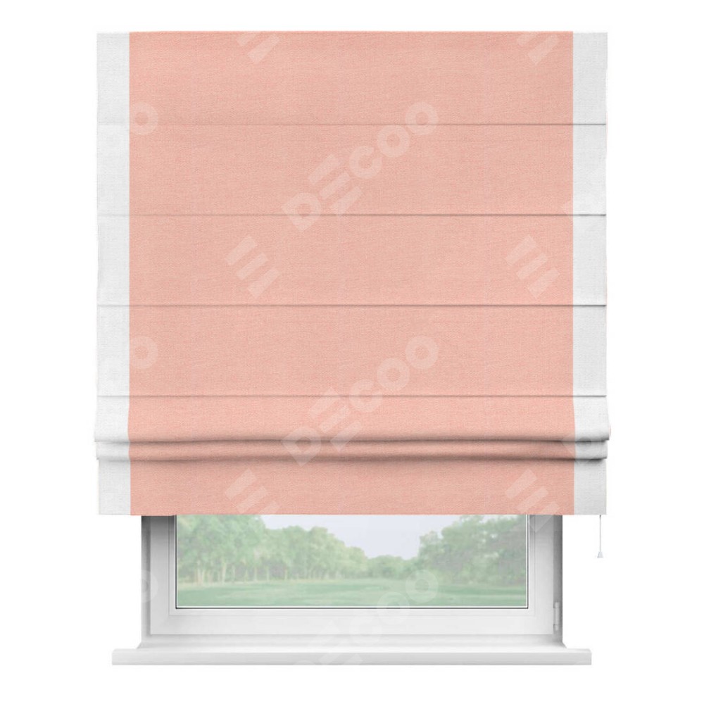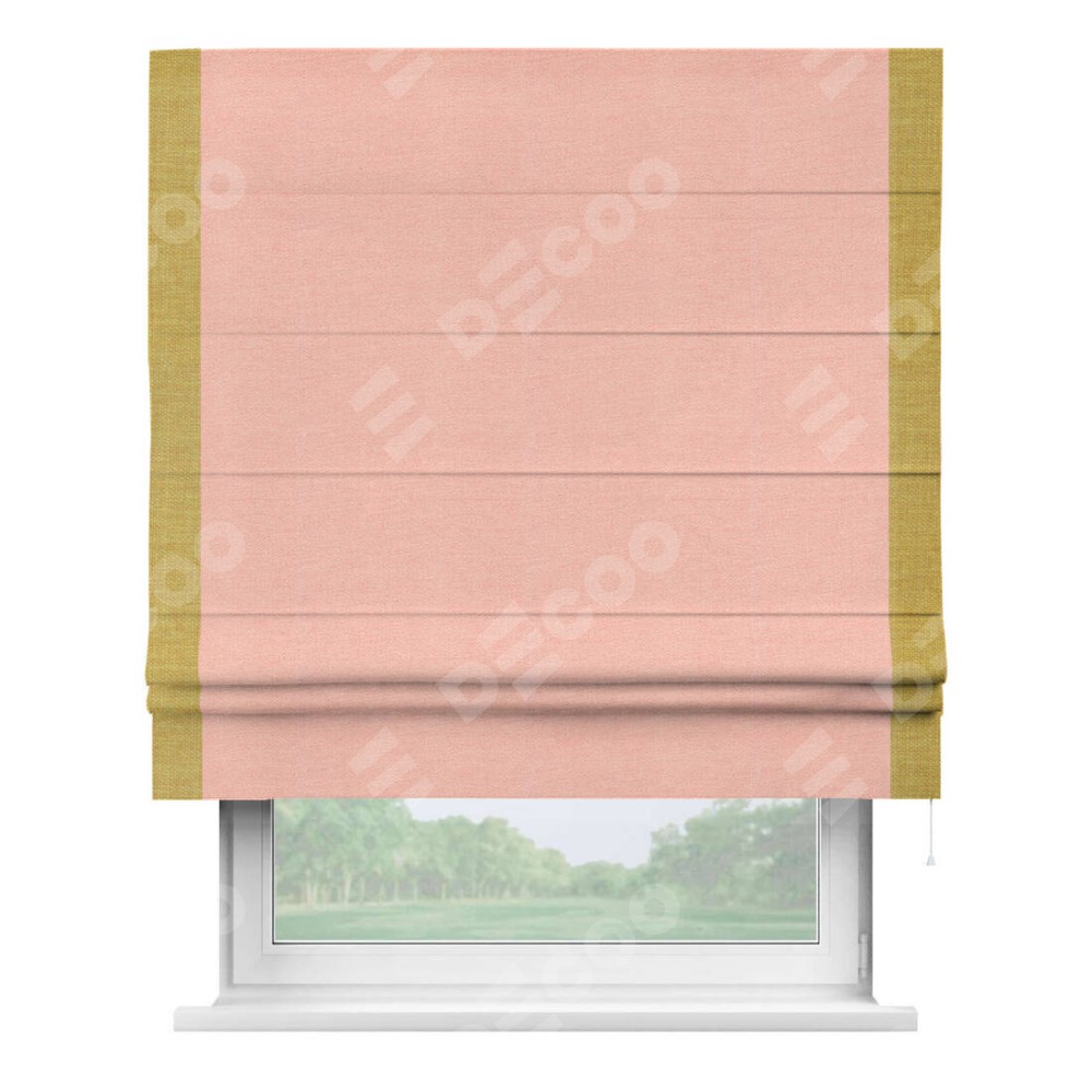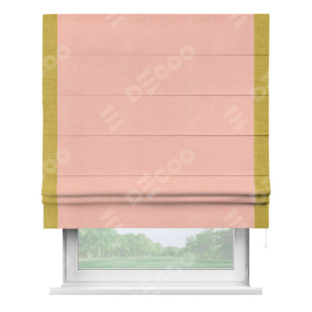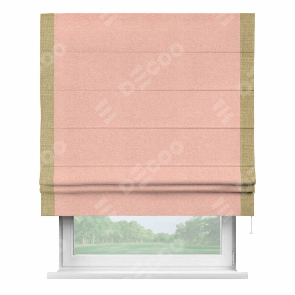 Римская штора производителя «Cortin», используется для проёма, пошита из ткани лён розовый, артикул 00005. Отделка шторы кантом «Стрим Дуо», ткань для канта используется из льна разной расцветки на выбор. Имеет универсальный механизм и подходит для монтажа: на потолок, на стену и в нишу.