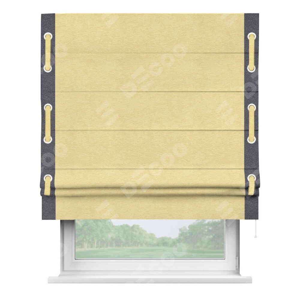 Римская штора производителя «Cortin», используется для проёма, пошита из ткани софт однотонный золотой, артикул 42934. Отделка шторы кантом «Стрим Дуо» на кантах расположены люверсы с пояском, ткань для канта используется из софта разной расцветки на выбор. Ткань для пояска обычно используется из основной ткани шторы, а так же можно сделать из любой расцветки по желанию. Имеет универсальный механизм и подходит для монтажа: на потолок, на стену и в нишу.