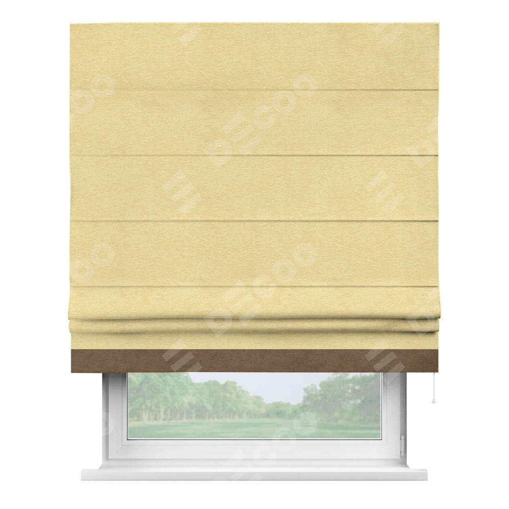 Римская штора производителя «Cortin», используется для проёма, пошита из ткани софт однотонный золотой, артикул 42934. Отделка шторы кантом «Джестер», ткань для канта используется из софта разной расцветки на выбор. Имеет универсальный механизм и подходит для монтажа: на потолок, на стену и в нишу.