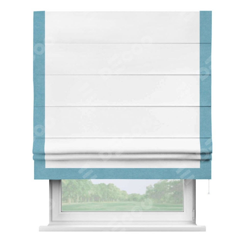 Римская штора производителя «Cortin», используется для проёма, пошита из ткани вельвет белоснежный, артикул ткани 19192. Отделка шторы кантом «Виктория», ткань для канта используется из вельвета разной расцветки на выбор. Имеет универсальный механизм и подходит для монтажа: на потолок, на стену и в нишу.