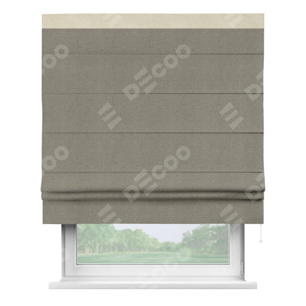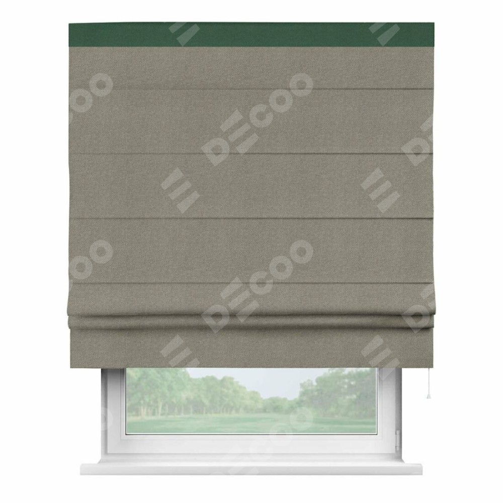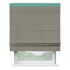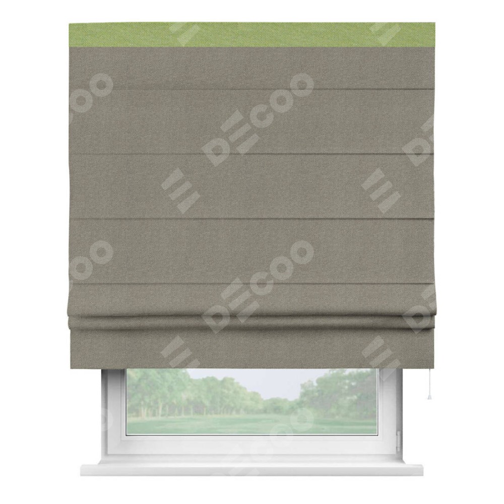 Римская штора производителя «Cortin», используется для проёма, пошита из ткани лён димаут cеро-зелёный, артикул 00003. Отделка шторы кантом «Кинг», ткань для канта используется из льна димаут разной расцветки на выбор. Имеет универсальный механизм и подходит для монтажа: на потолок, на стену и в нишу.
