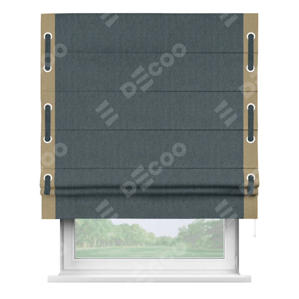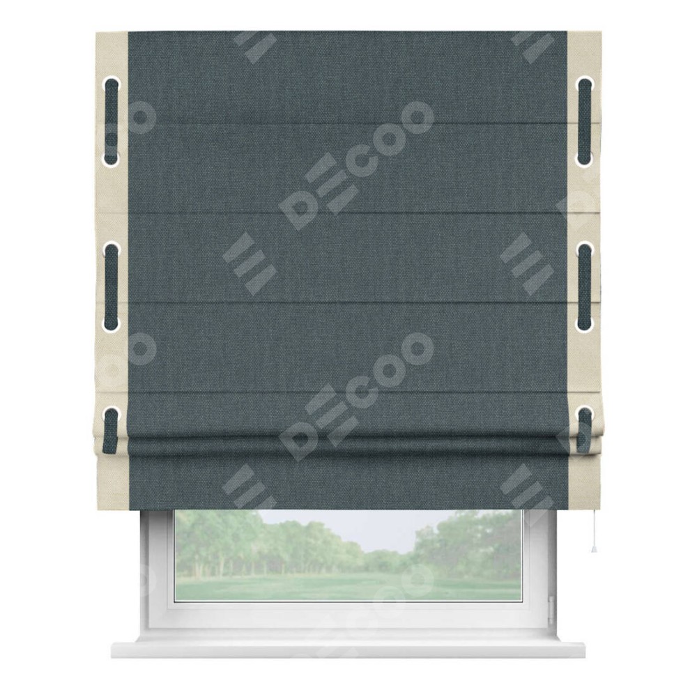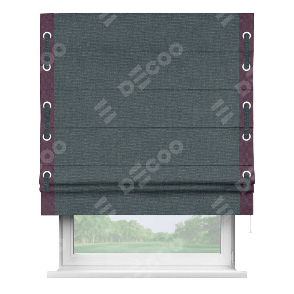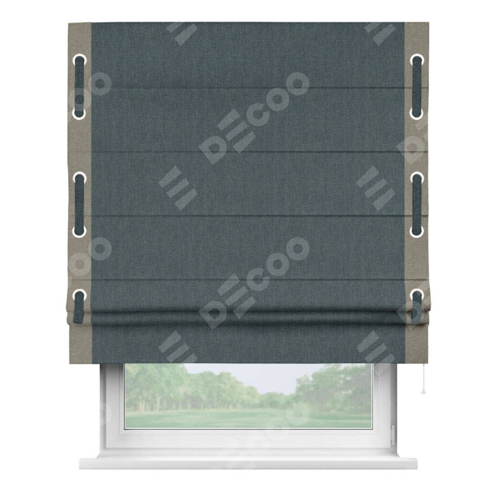 Римская штора производителя «Cortin», используется для проёма, пошита из ткани лён димаут серо-синий, артикул 03238. Отделка шторы кантом «Стрим Дуо» на кантах расположены люверсы с пояском, ткань для канта используется лён димаут разной расцветки на выбор. Ткань для пояска обычно используется из основной ткани шторы, а так же можно сделать из любой расцветки по желанию. Имеет универсальный механизм и подходит для монтажа: на потолок, на стену и в нишу.