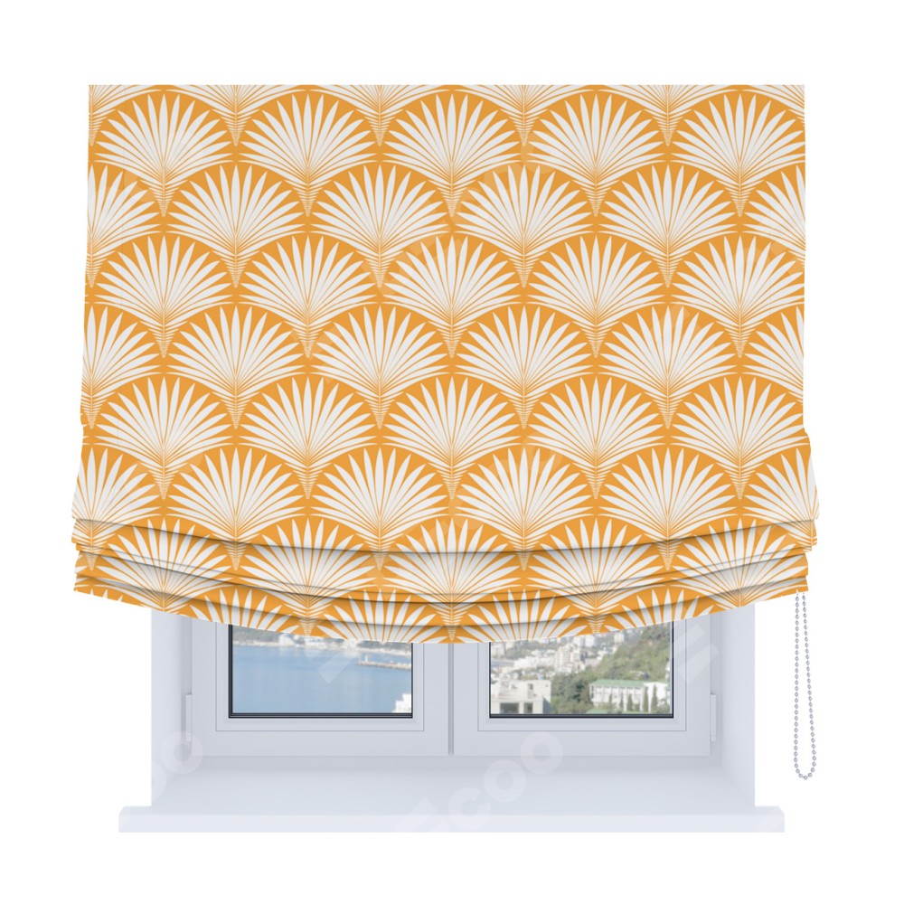 Римская штора Soft производителя «Cortin», используется для проёма, пошита из ткани блэкаут с нанесением сублимационной печати «Арт-деко листья желтый». Имеет универсальный механизм и подходит для монтажа: на потолок, на стену и в нишу. В отличие от стандартных римских штор, римская штора Soft не имеет горизонтальных вставок и нижнего отвеса. Это позволяет ткани произвольно драпироваться в свободные мягкие складки.