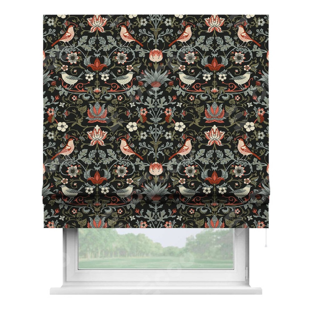 Римская штора производителя «Cortin», используется для проёма, пошита из ткани блэкаут с нанесением сублимационной печати «Зачарованные птицы». Имеет универсальный механизм и подходит для монтажа: на потолок, на стену и в нишу.