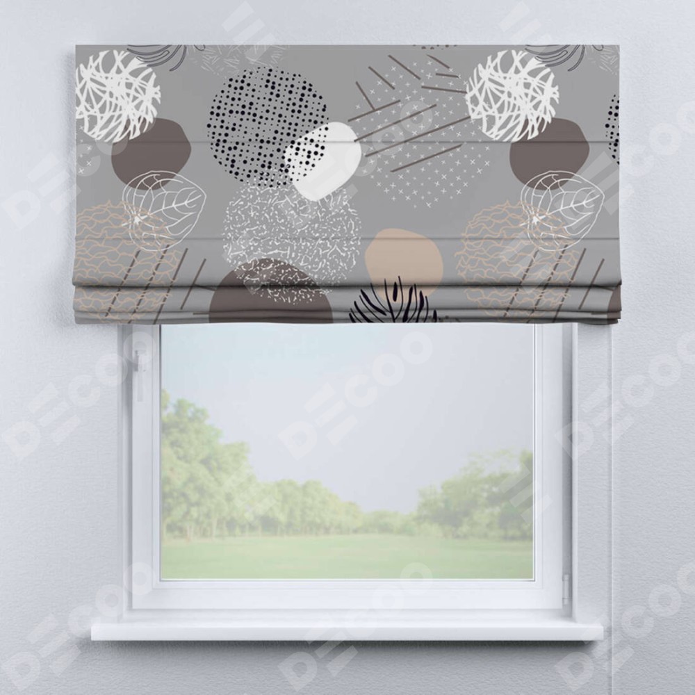 Римская штора производителя «Cortin», используется для проёма, пошита из ткани блэкаут с нанесением сублимационной печати «Ботаника абстракция». Имеет универсальный механизм и подходит для монтажа: на потолок, на стену и в нишу.