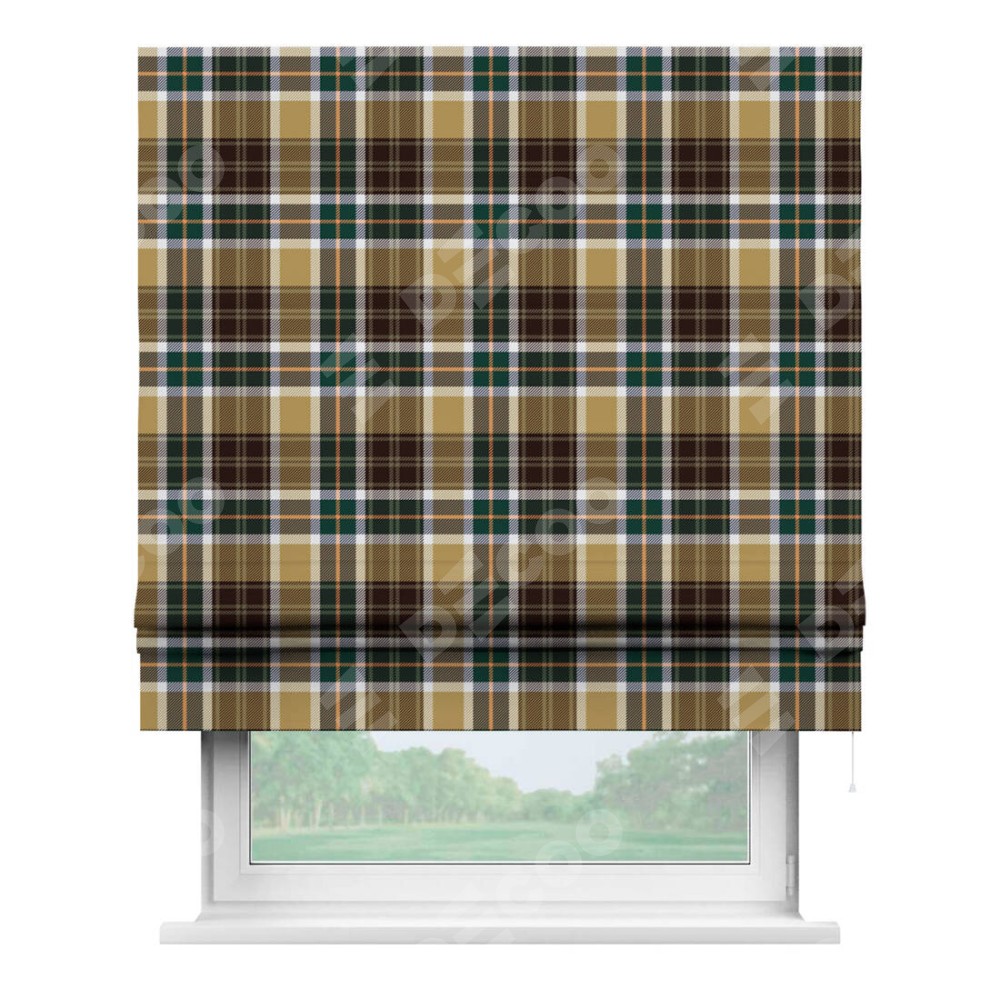 Римская штора производителя «Cortin», используется для проёма, пошита из ткани блэкаут с нанесением сублимационной печати «Бежево-зелёная клетка». Имеет универсальный механизм и подходит для монтажа: на потолок, на стену и в нишу.