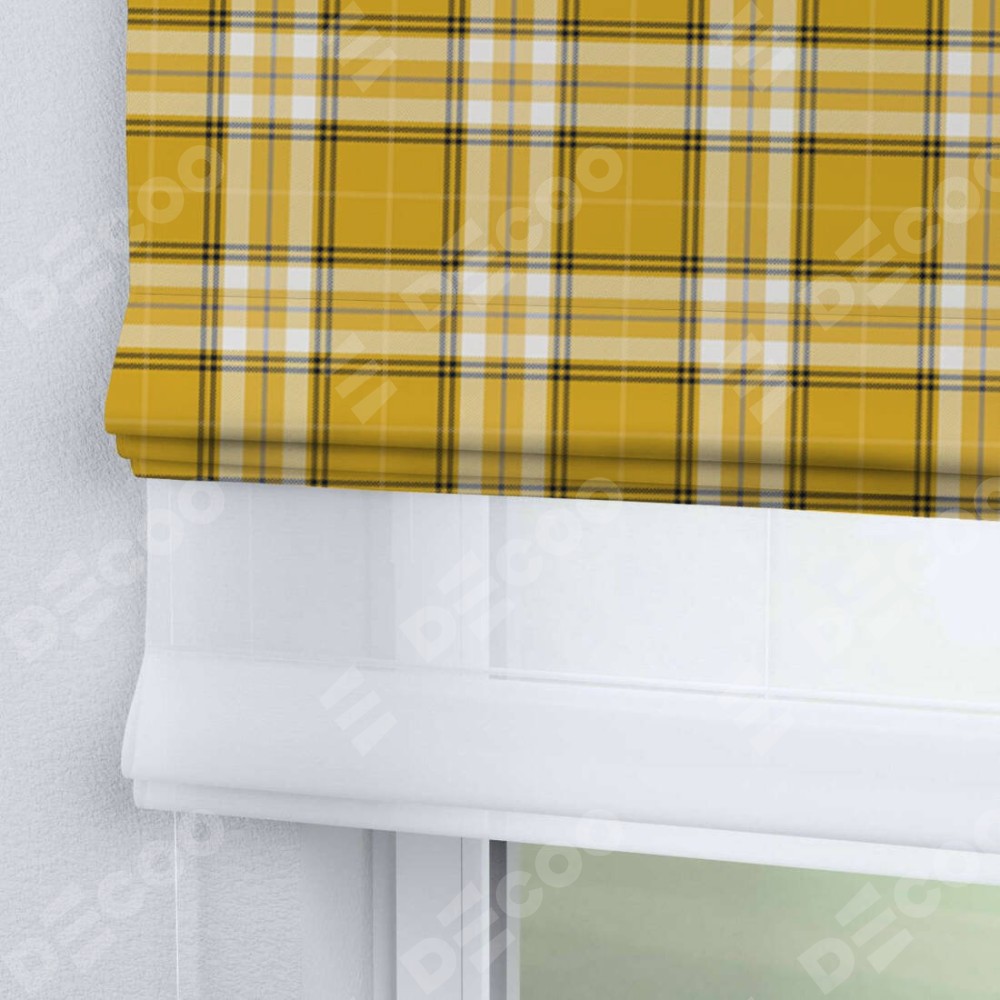 Римская штора день-ночь производителя «Cortin», используется для проёма, пошита из двух полотен, с лицевой блэкаут с нанесением сублимационной печати «Желто-горчичная клетка», вторая ткань тюль (по стандарту комплектуется тюль белого цвета артикул V-01). Имеет универсальный механизм и подходит для монтажа: на потолок, на стену и в нишу.