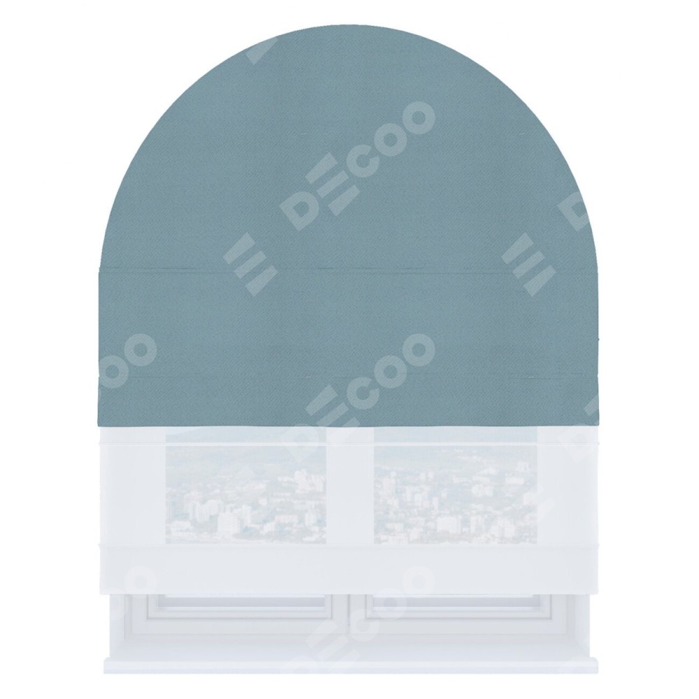 Римская штора день-ночь производителя «Cortin», используется для арочного проёма, пошита из двух полотен, с лицевой стороны блэкаут однотонный серо-голубой артикул 29327−2, вторая ткань тюль (по стандарту комплектуется тюль белого цвета артикул V-01). Штора шьётся по индивидуальным размерам, для данного типа римской шторы возможная ширина от 60 до 300 см. Удобное управление каждой шторой отдельно.