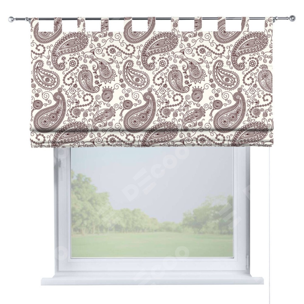 Римская штора производителя «Cortin», используется для проёма, пошита из ткани блэкаут с нанесением сублимационной печати «Индийский узор». Данная модель пошита на петлях, комплектуется на выбор круглым карнизом и подходит для монтажа на стену. Римская штора на петлях имеет простую систему регулировки высоты, отличительным преимуществом данной модели является простой способ монтажа. Достаточно повесить ее на трубу и штора готова!