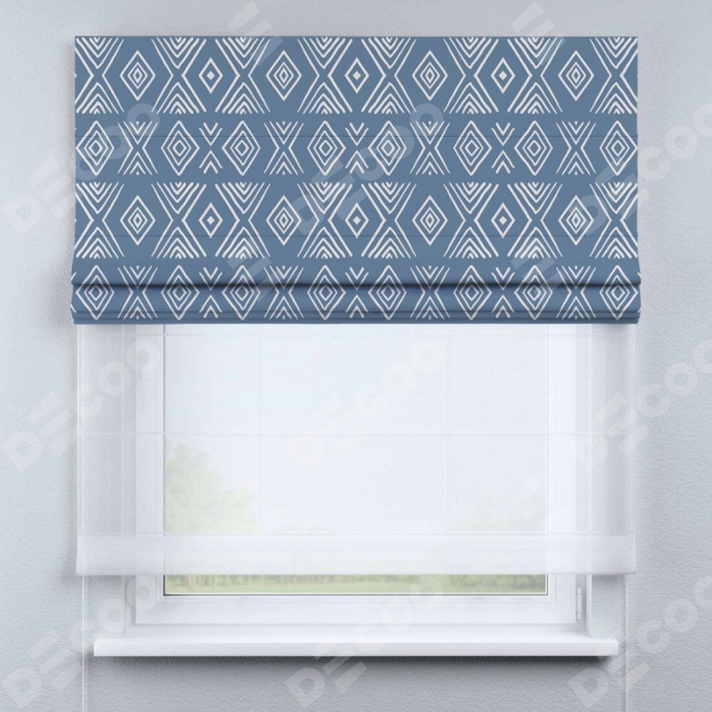 Римская штора день-ночь производителя «Cortin», используется для проёма, пошита из двух полотен, с лицевой блэкаут с нанесением сублимационной печати «Графический орнамент», вторая ткань тюль (по стандарту комплектуется тюль белого цвета артикул V-01). Имеет универсальный механизм и подходит для монтажа: на потолок, на стену и в нишу.