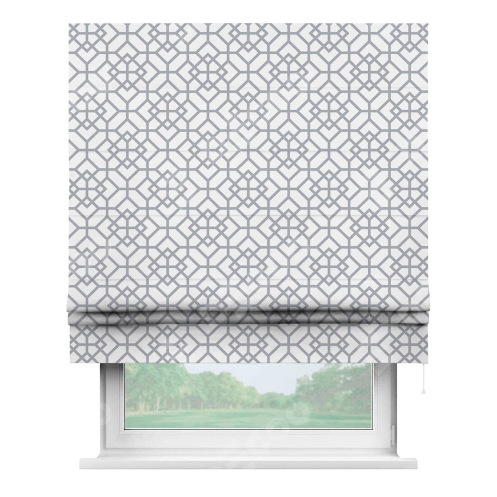 Римская штора производителя «Cortin», используется для проёма, пошита из ткани блэкаут с нанесением сублимационной печати «Архитектурный орнамент». Имеет универсальный механизм и подходит для монтажа: на потолок, на стену и в нишу.