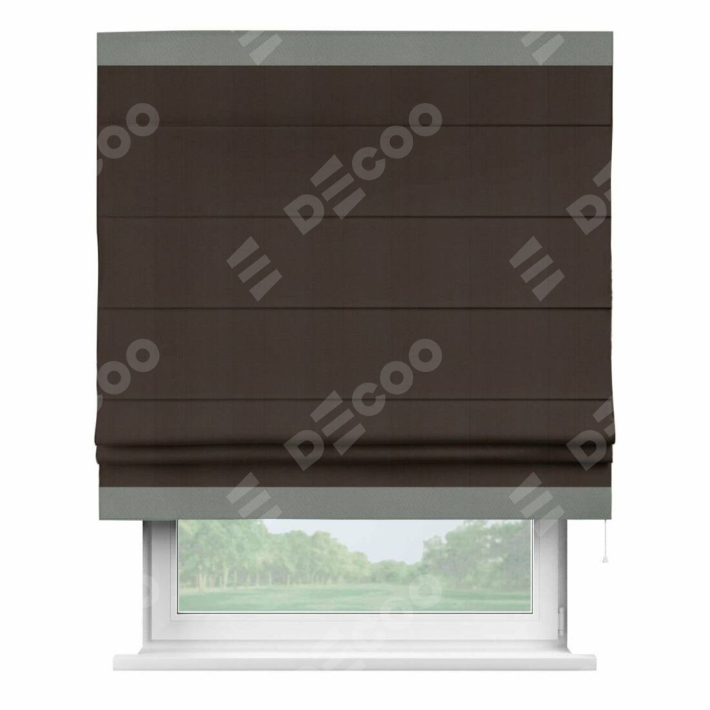 Римская штора производителя «Cortin», используется для проёма, пошита из ткани блэкаут однотонный венге, артикул ткани 88286. Отделка шторы кантом «Горизонт», ткань для канта используется из блэкаута однотонного разной расцветки на выбор. Имеет универсальный механизм и подходит для монтажа: на потолок, на стену и в нишу.