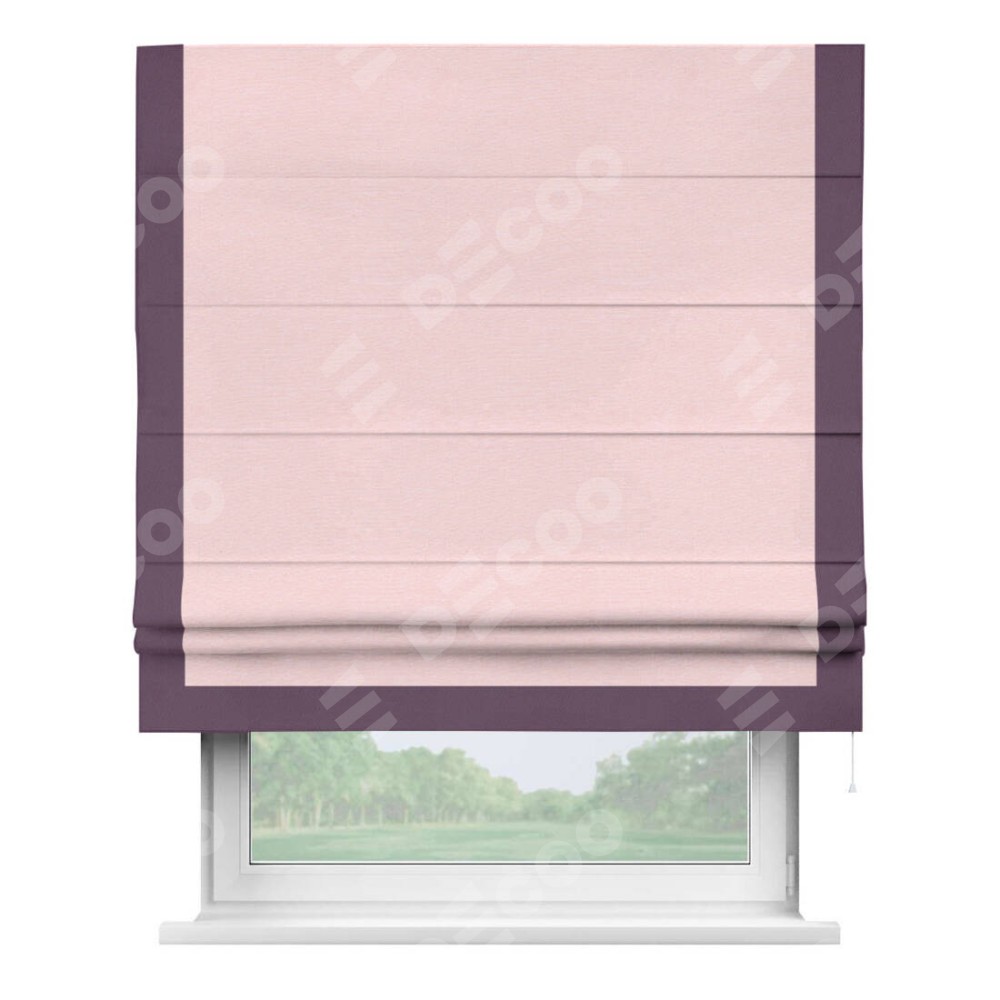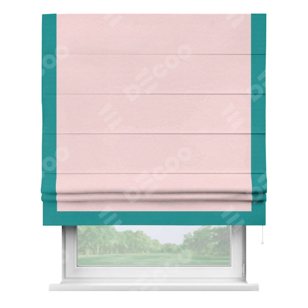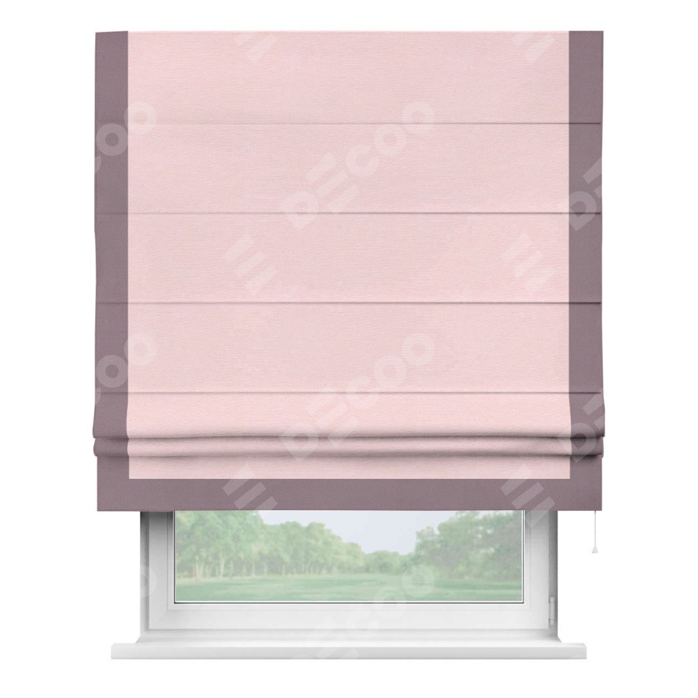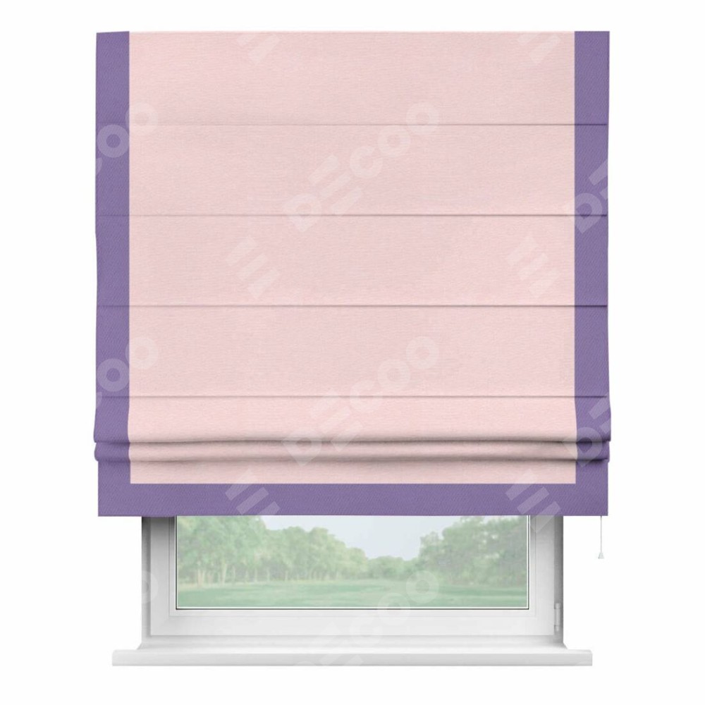Римская штора производителя «Cortin», используется для проёма, пошита из ткани блэкаут однотонный розовый, артикул ткани 83046. Отделка шторы кантом «Виктория», ткань для канта используется из блэкаута однотонного разной расцветки на выбор. Имеет универсальный механизм и подходит для монтажа: на потолок, на стену и в нишу.