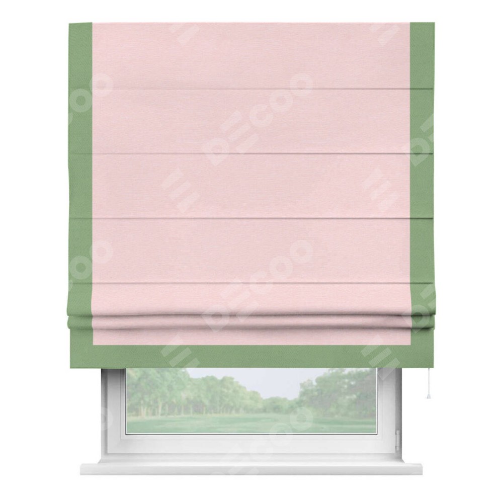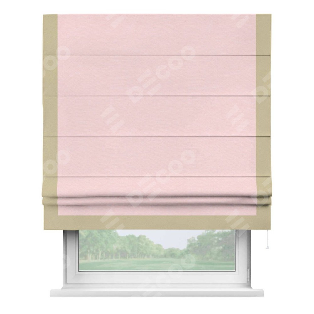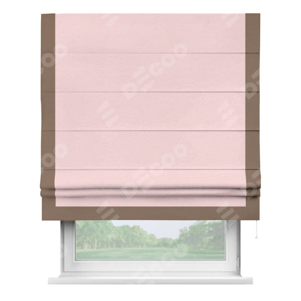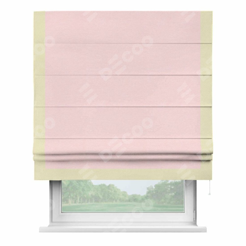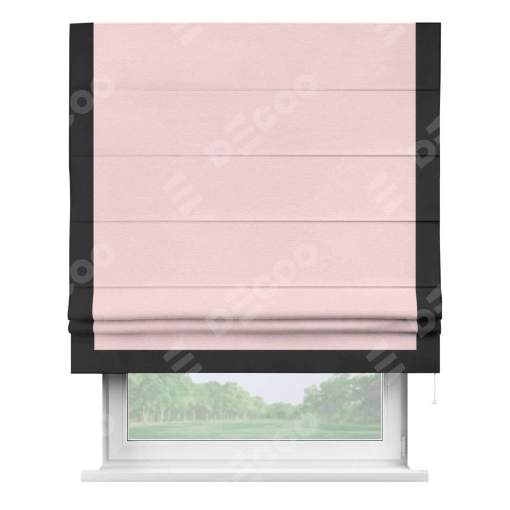 Римская штора производителя «Cortin», используется для проёма, пошита из ткани блэкаут однотонный розовый, артикул ткани 83046. Отделка шторы кантом «Виктория», ткань для канта используется из блэкаута однотонного разной расцветки на выбор. Имеет универсальный механизм и подходит для монтажа: на потолок, на стену и в нишу.