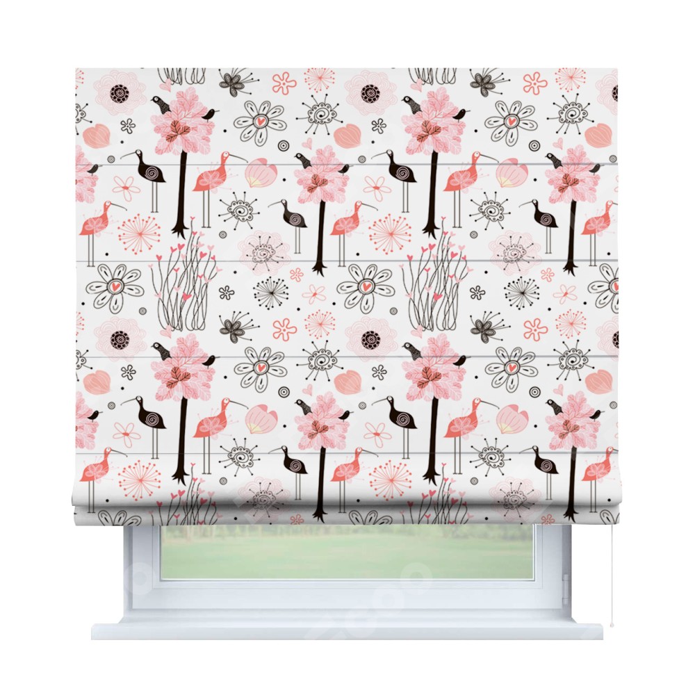 Римская штора производителя «Cortin», используется для проёма, пошита из ткани блэкаут с нанесением сублимационной печати «Любопытные птички». Имеет универсальный механизм и подходит для монтажа: на потолок, на стену и в нишу.