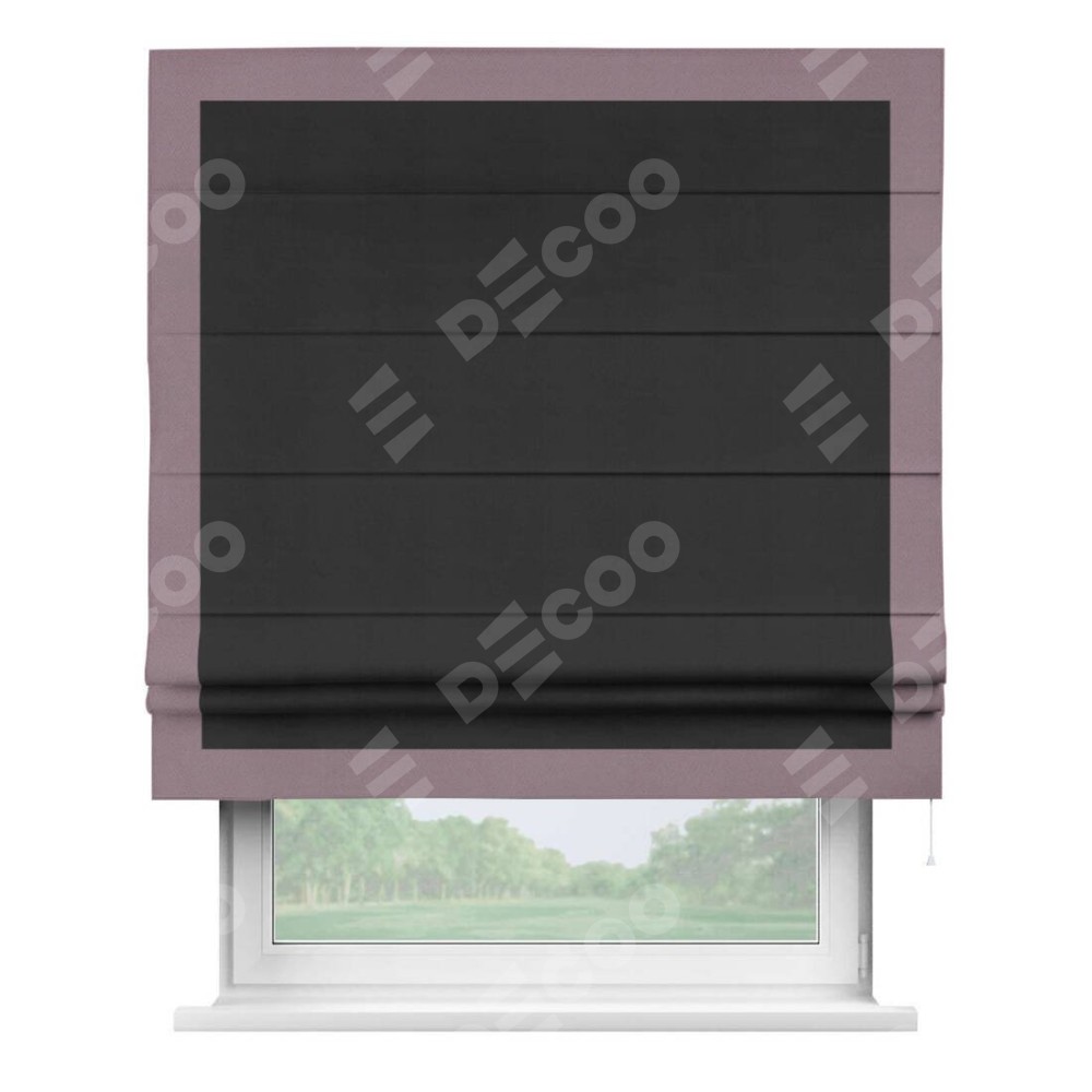 Римская штора производителя «Cortin», используется для проёма, пошита из ткани блэкаут однотонный черный, артикул ткани 79904. Отделка шторы кантом «Чесс», ткань для канта используется из блэкаута однотонного разной расцветки на выбор. Имеет универсальный механизм и подходит для монтажа: на потолок, на стену и в нишу.