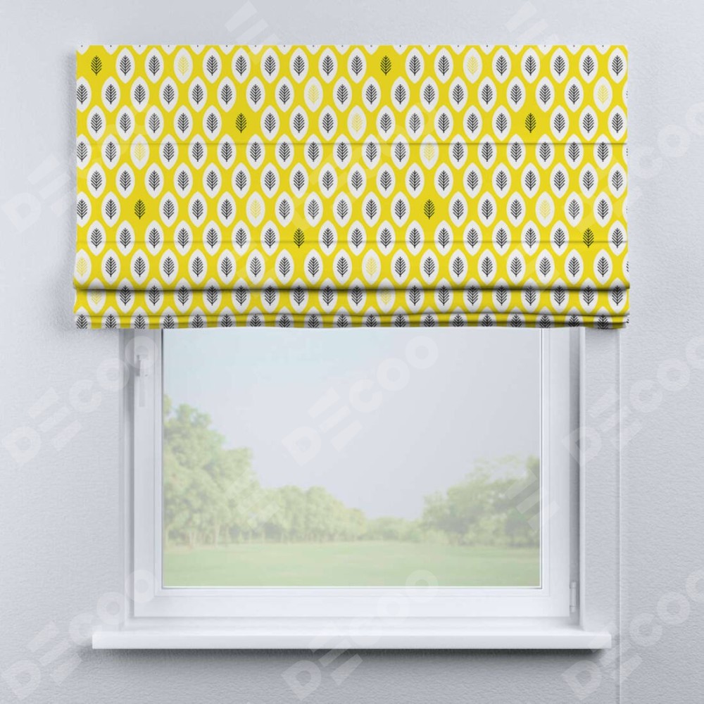 Римская штора производителя «Cortin», используется для проёма, пошита из ткани блэкаут с нанесением сублимационной печати «Солнечные листья». Имеет универсальный механизм и подходит для монтажа: на потолок, на стену и в нишу.