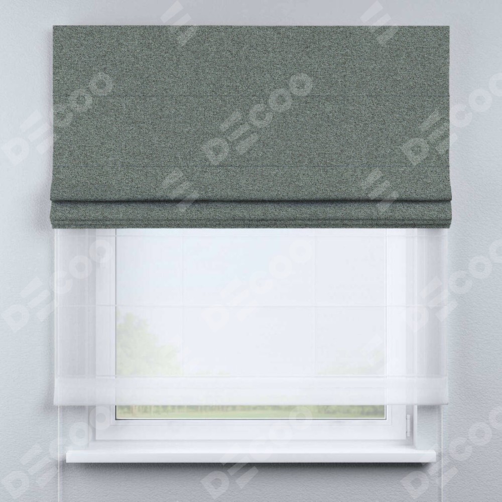 Римская штора день-ночь производителя «Cortin», используется для проёма, пошита из двух полотен, с лицевой стороны лён блэкаут серый артикул 69447, вторая ткань тюль (по стандарту комплектуется тюль белого цвета артикул V-01). Имеет универсальный механизм и подходит для монтажа: на потолок, на стену и в нишу.