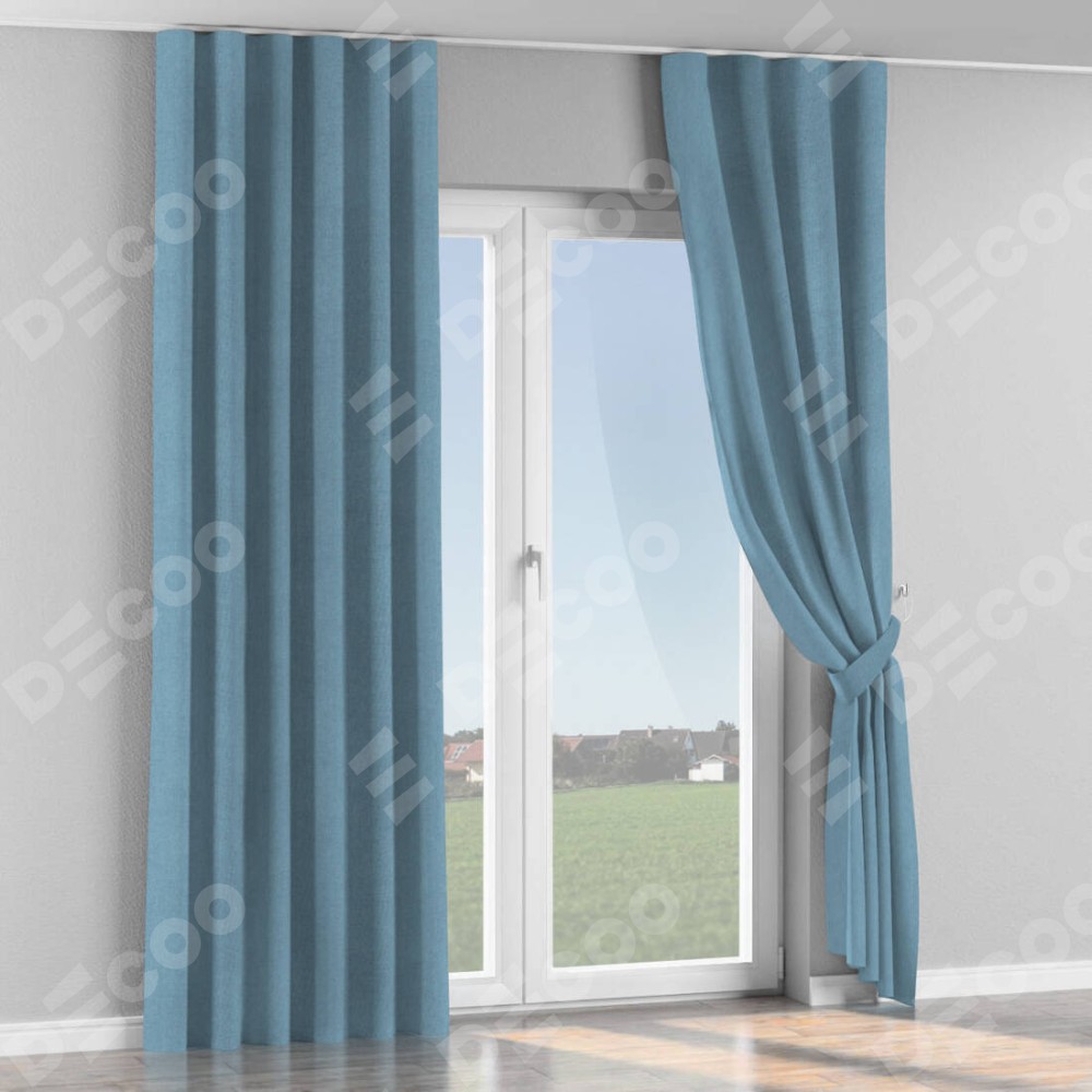 Комплект прямых штор, от производителя «Cortin», пошиты из ткани лён блэкаут голубой, артикул ткани 69574. С изнаночной стороны в верхней части штор пристрачивается шторная лента с декоративными складками «Волна». Для создания элегантных складок прямые шторы шьются по стандарту с коэффициентом 1:2 (на 100 см. ширины проёма 200 см. ширины ткани).
