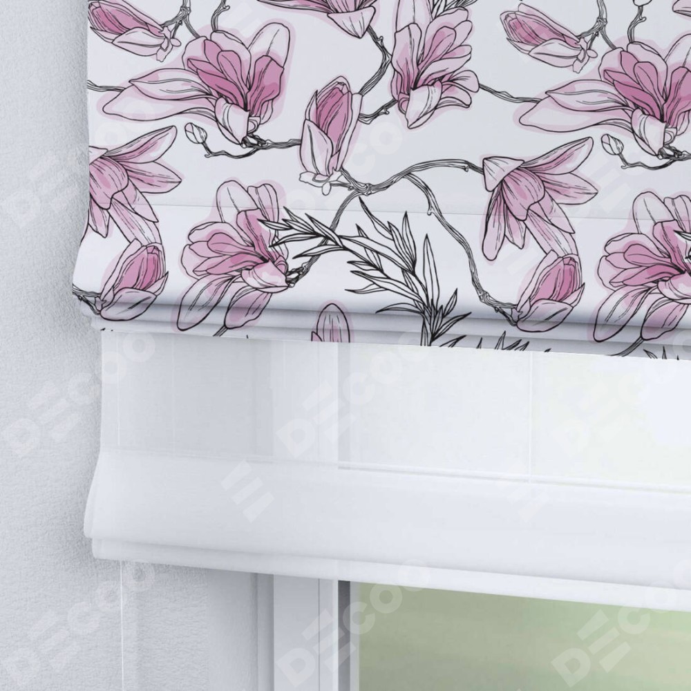 Римская штора день-ночь производителя «Cortin», используется для проёма, пошита из двух полотен, с лицевой блэкаут с нанесением сублимационной печати «Цветки магнолии», вторая ткань тюль (по стандарту комплектуется тюль белого цвета артикул V-01). Имеет универсальный механизм и подходит для монтажа: на потолок, на стену и в нишу.