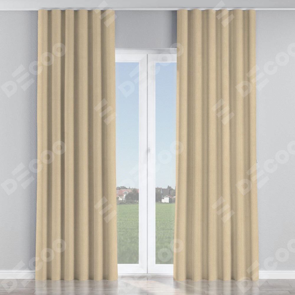 Комплект прямых штор, от производителя «Cortin», пошиты из ткани блэкаут однотонный кофейно-бежевый, артикул ткани 12095−1. С изнаночной стороны в верхней части штор пристрачивается шторная лента с декоративными складками «Волна». Для создания элегантных складок прямые шторы шьются по стандарту с коэффициентом 1:2 (на 100 см. ширины проёма 200 см. ширины ткани).