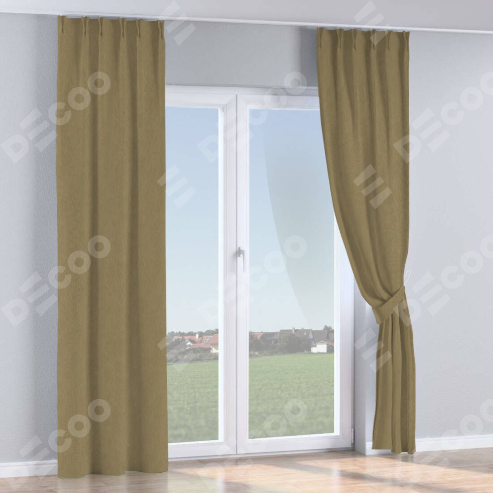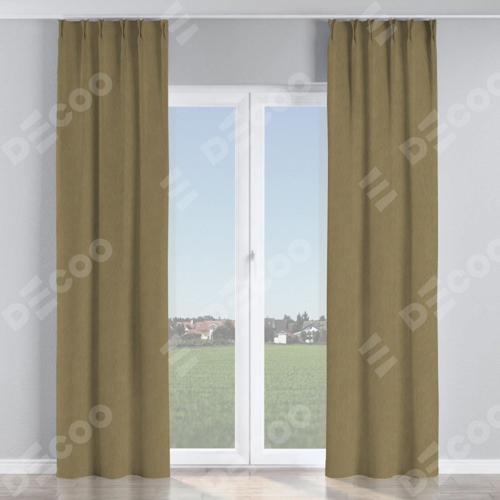 Комплект прямых штор, от производителя «Cortin», пошиты из ткани блэкаут однотонный бежево-золотой, артикул ткани 12095−2. С изнаночной стороны в верхней части штор пристрачивается шторная лента с декоративными складками «Кустик». Для создания элегантных складок прямые шторы шьются по стандарту с коэффициентом 1:2 (на 100 см. ширины проёма 200 см. ширины ткани).
