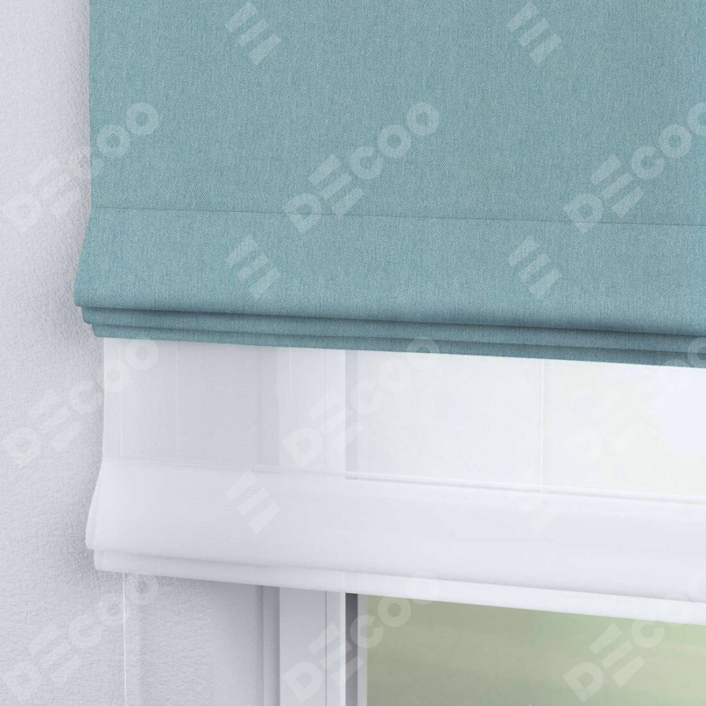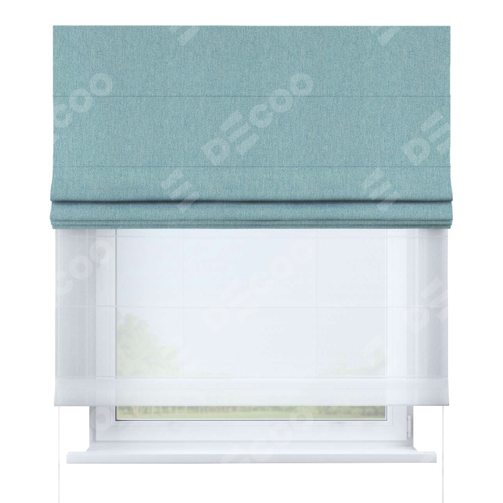 Римская штора день-ночь производителя «Cortin», используется для проёма, пошита из двух полотен, с лицевой стороны твид блэкаут небесно-голубой артикул 21578, вторая ткань тюль (по стандарту комплектуется тюль белого цвета артикул V-01). Имеет универсальный механизм и подходит для монтажа: на потолок, на стену и в нишу.