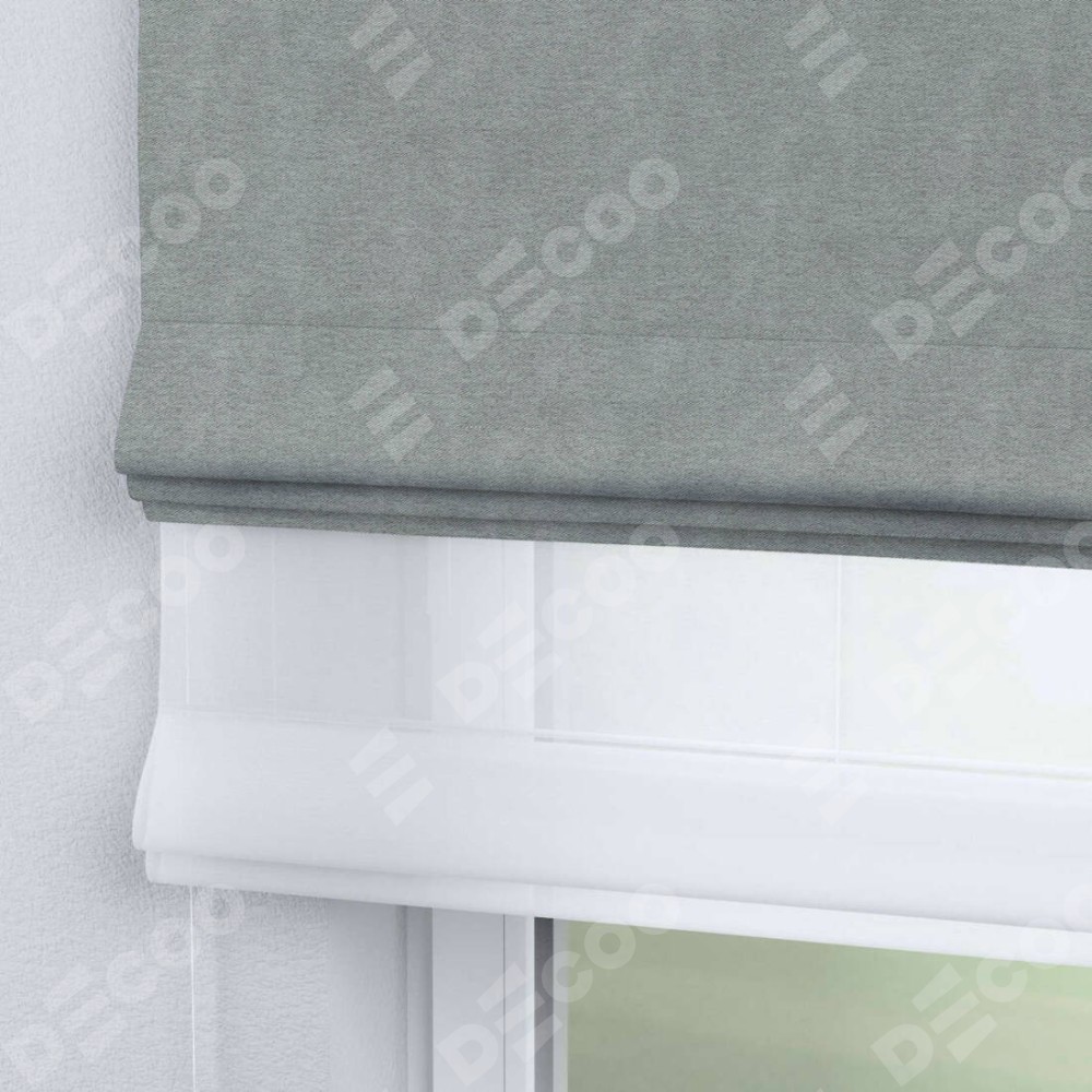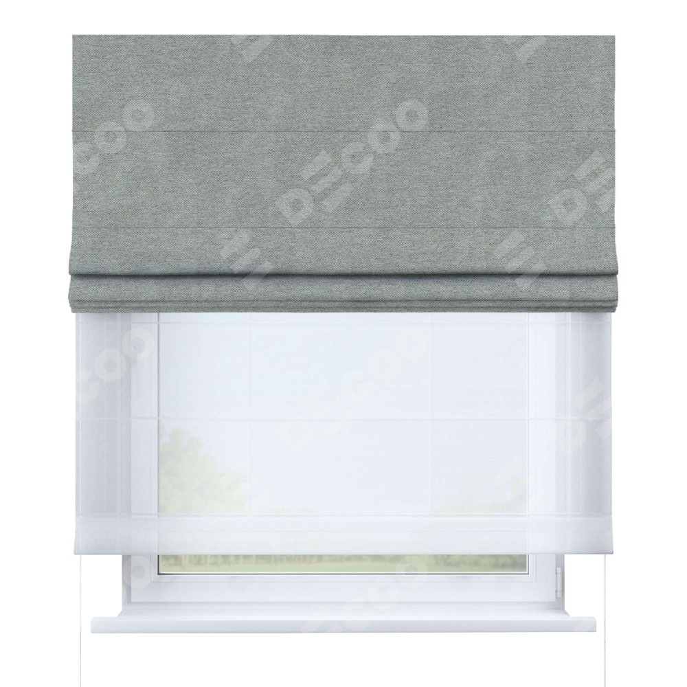 Римская штора день-ночь производителя «Cortin», используется для проёма, пошита из двух полотен, с лицевой стороны твид блэкаут светло-серый артикул 21576, вторая ткань тюль (по стандарту комплектуется тюль белого цвета артикул V-01). Имеет универсальный механизм и подходит для монтажа: на потолок, на стену и в нишу.