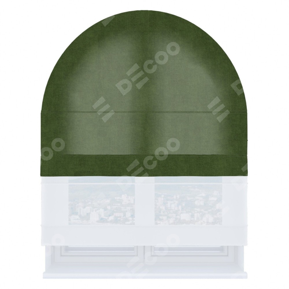 Римская штора день-ночь производителя «Cortin», используется для арочного проёма, пошита из двух полотен, с лицевой стороны вельвет тёмно-салатовый артикул 33805, вторая ткань тюль (по стандарту комплектуется тюль белого цвета артикул V-01). Штора шьётся по индивидуальным размерам, для данного типа римской шторы возможная ширина от 60 до 300 см. Удобное управление каждой шторой отдельно.
