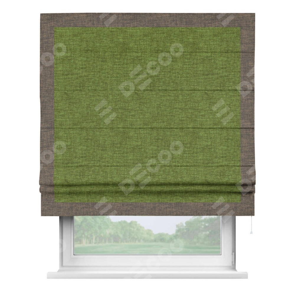 Римская штора производителя «Cortin», используется для проёма, пошита из ткани рогожка димаут салатовый, артикул 80423. Отделка шторы кантом «Чесс», ткань для канта используется из рогожки димаут разной расцветки на выбор. Имеет универсальный механизм и подходит для монтажа: на потолок, на стену и в нишу.