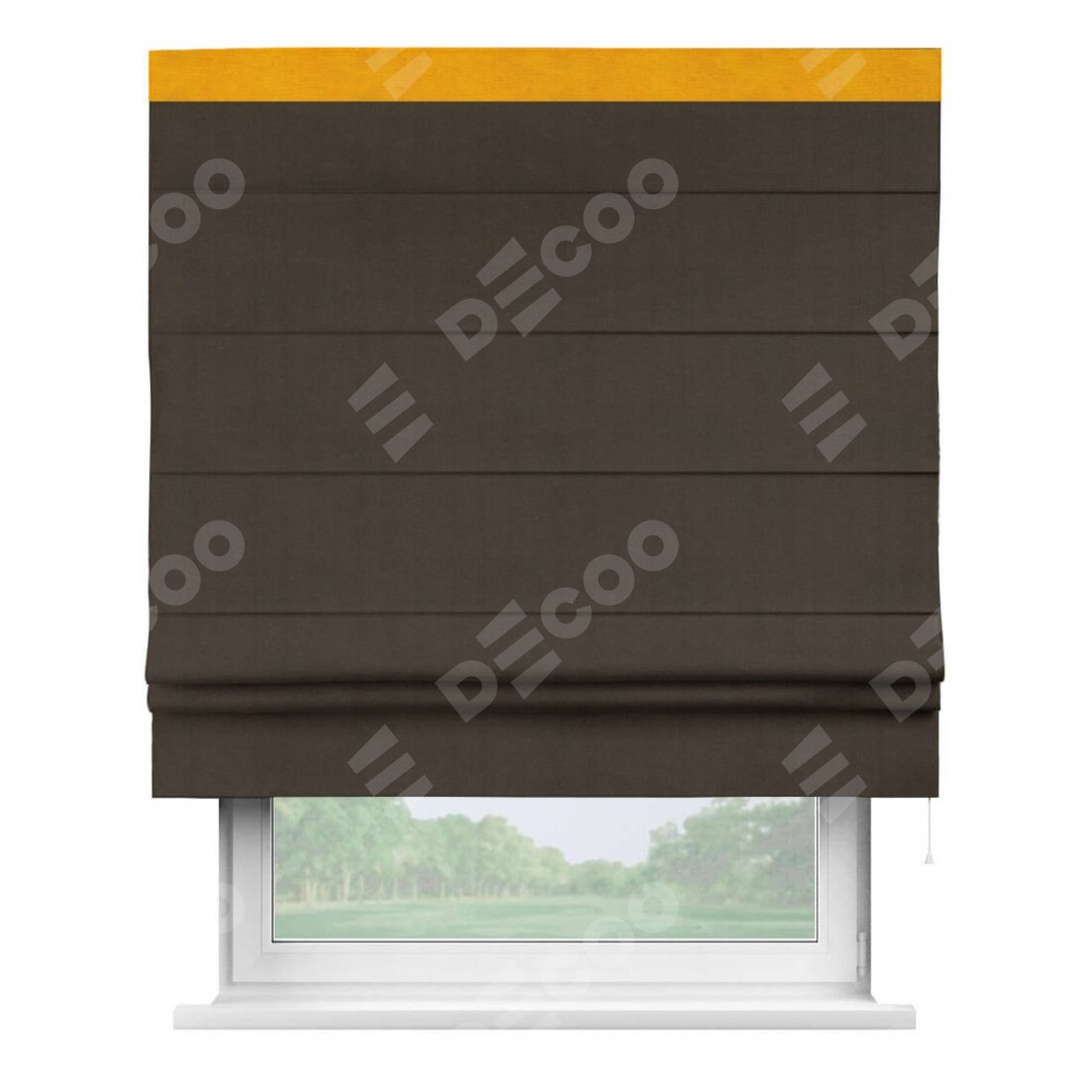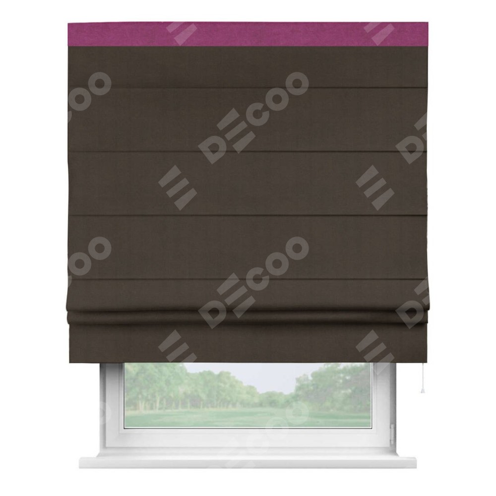 Римская штора производителя «Cortin», используется для проёма, пошита из ткани вельвет тёмно-коричневый, артикул ткани 30991. Отделка шторы кантом «Кинг», ткань для канта используется из вельвета разной расцветки на выбор. Имеет универсальный механизм и подходит для монтажа: на потолок, на стену и в нишу.