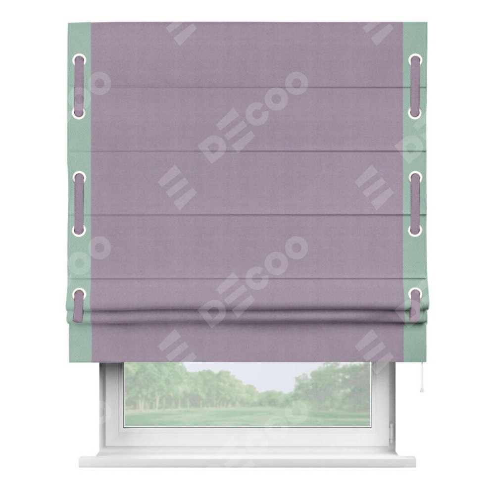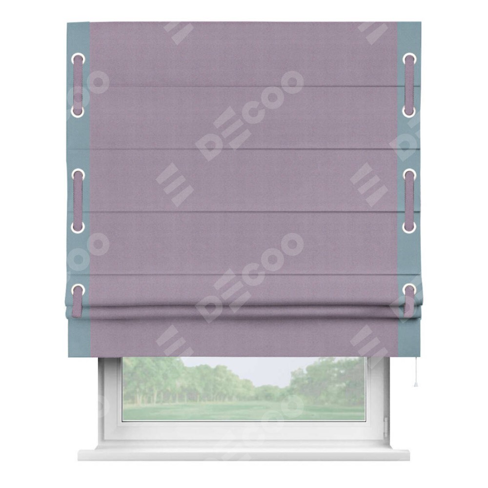 Римская штора производителя «Cortin», используется для проёма, пошита из ткани блэкаут однотонный светло-сиреневый, артикул ткани 29333−1. Отделка шторы кантом «Стрим Дуо» на кантах расположены люверсы с пояском, ткань для канта используется из блэкаута однотонного разной расцветки на выбор. Ткань для пояска обычно используется из основной ткани шторы, а так же можно сделать из любой расцветки по желанию. Имеет универсальный механизм и подходит для монтажа: на потолок, на стену и в нишу.
