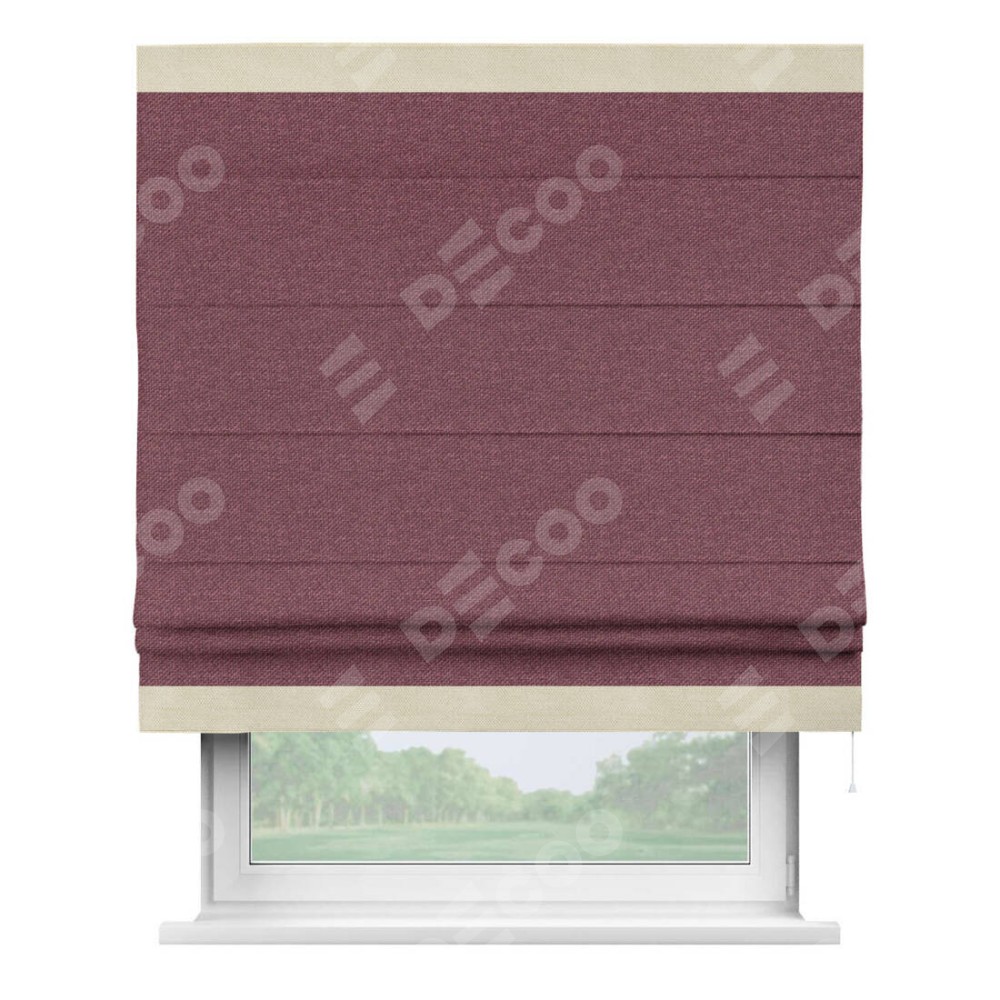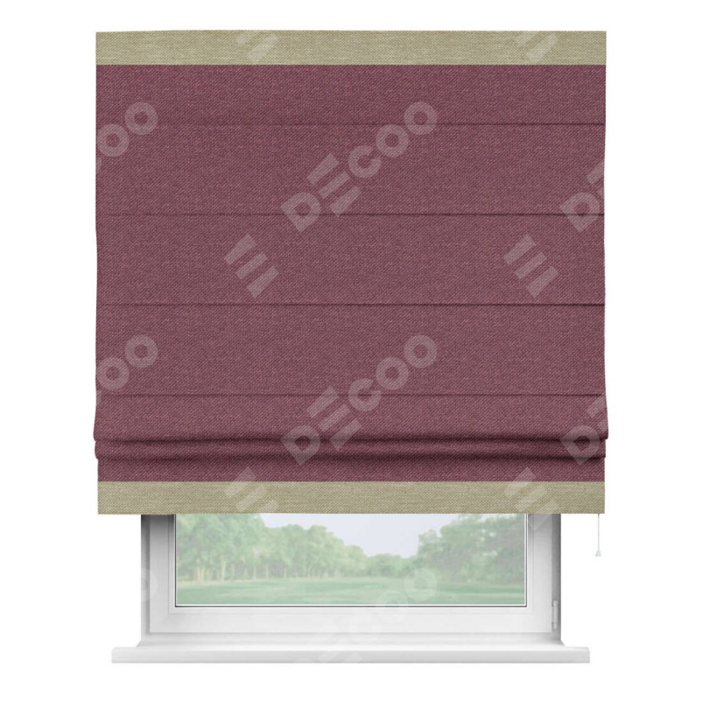 Римская штора производителя «Cortin», используется для проёма, пошита из ткани лён димаут марсала, артикул 1602. Отделка шторы кантом «Горизонт», ткань для канта используется из льна димаут разной расцветки на выбор. Имеет универсальный механизм и подходит для монтажа: на потолок, на стену и в нишу.
