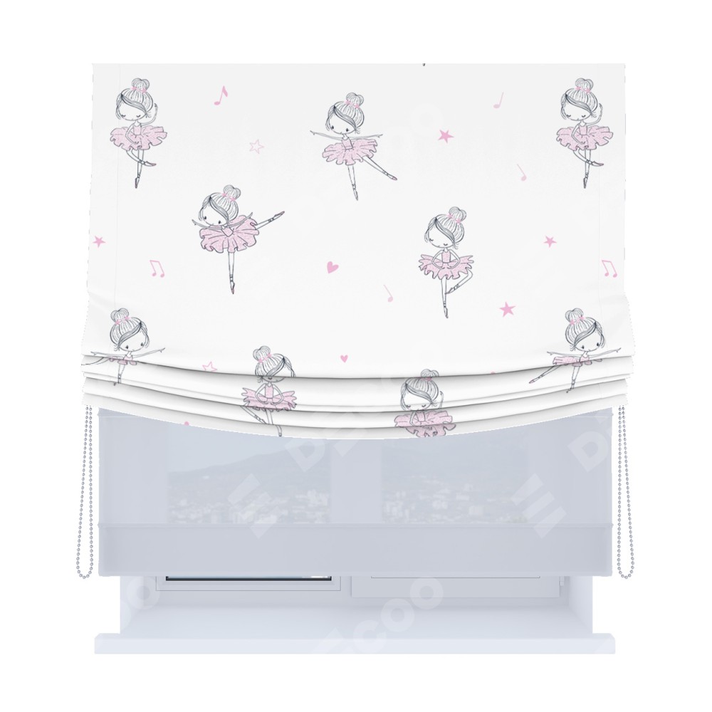 Римская штора день-ночь производителя «Cortin», используется для проёма, пошита из двух полотен, с лицевой блэкаут с нанесением сублимационной печати «Маленькая балерина», вторая ткань тюль (по стандарту комплектуется тюль белого цвета артикул V-01). Имеет универсальный механизм и подходит для монтажа: на потолок, на стену и в нишу. Удобное управление каждой шторой отдельно.