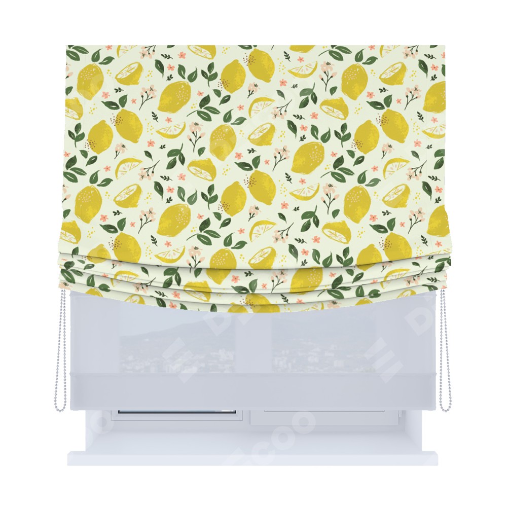 Римская штора день-ночь производителя «Cortin», используется для проёма, пошита из двух полотен, с лицевой блэкаут с нанесением сублимационной печати «Сочные лимоны», вторая ткань тюль (по стандарту комплектуется тюль белого цвета артикул V-01). Имеет универсальный механизм и подходит для монтажа: на потолок, на стену и в нишу. Удобное управление каждой шторой отдельно.