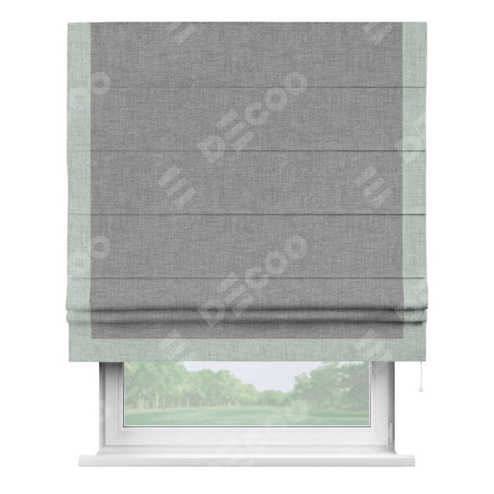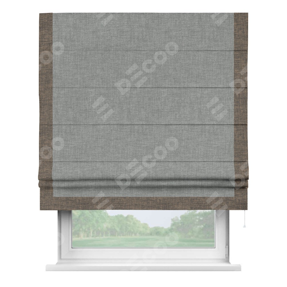 Римская штора производителя «Cortin», используется для проёма, пошита из ткани рогожка димаут тёмно-серый, артикул 80418. Отделка шторы кантом «Виктория», ткань для канта используется из рогожки димаут разной расцветки на выбор. Имеет универсальный механизм и подходит для монтажа: на потолок, на стену и в нишу.