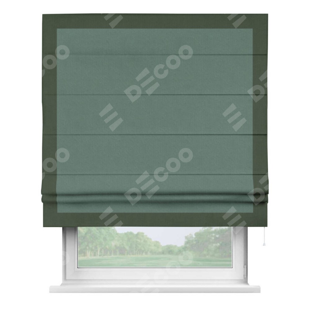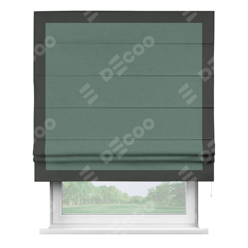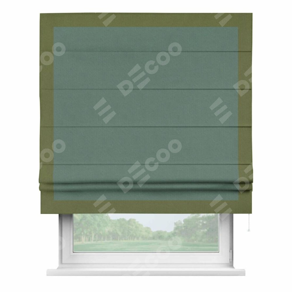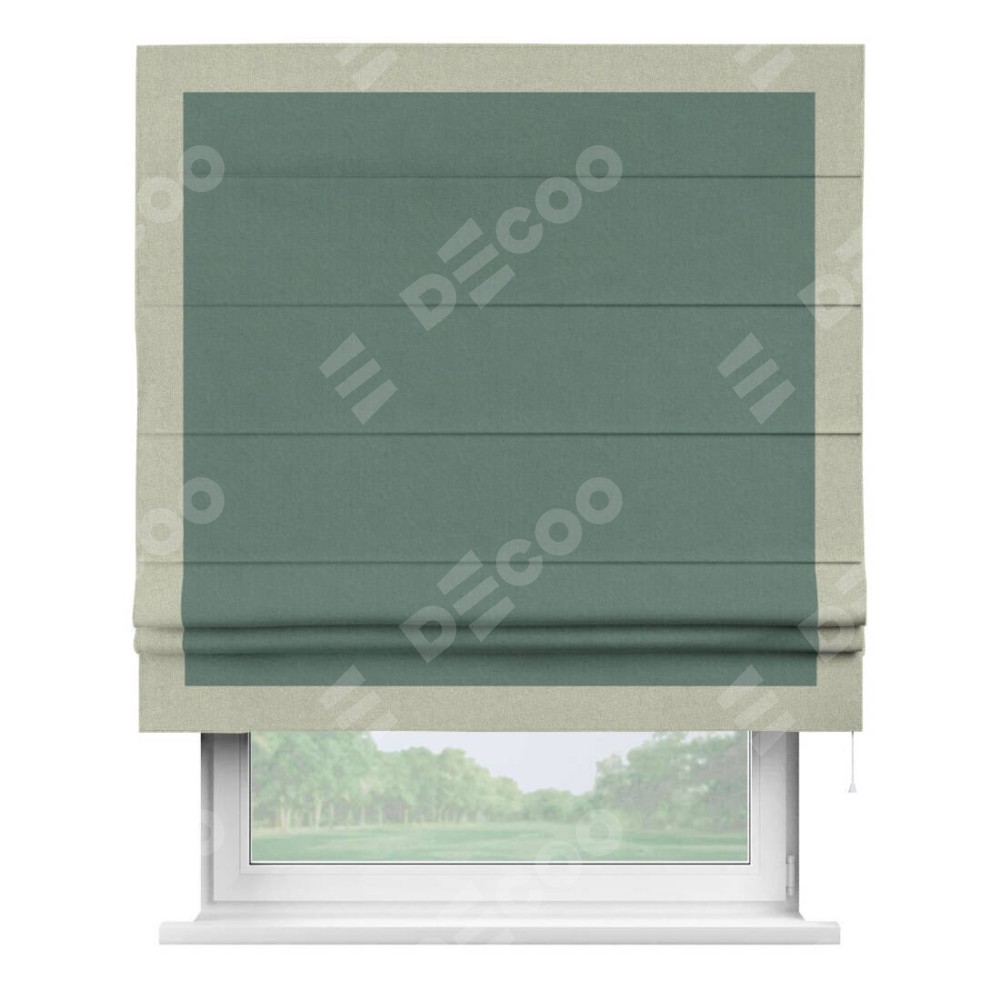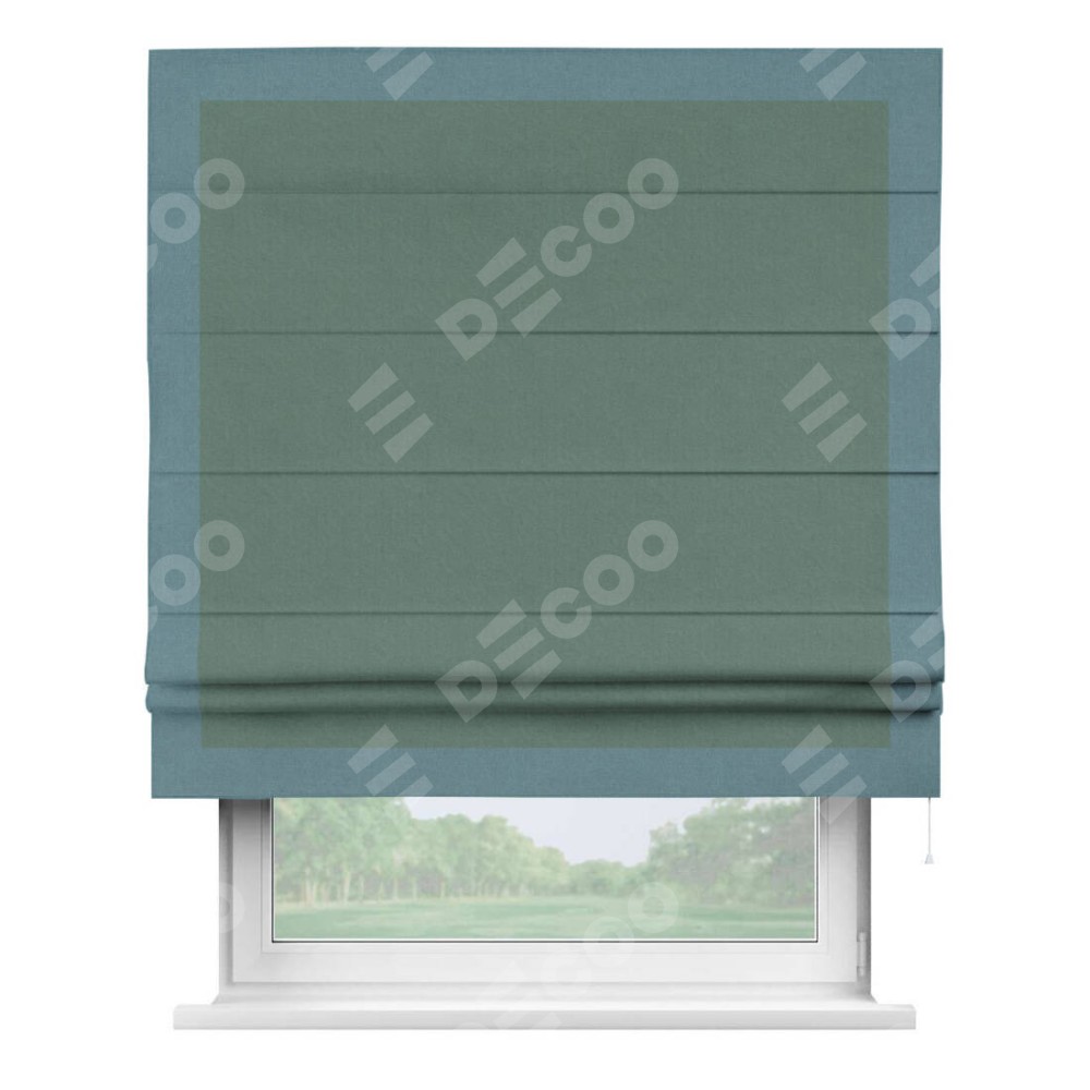 Римская штора производителя «Cortin», используется для проёма, пошита из ткани лён блэкаут бирюзовый, артикул 69517. Отделка шторы кантом «Чесс», ткань для канта используется из льна разной расцветки на выбор. Имеет универсальный механизм и подходит для монтажа: на потолок, на стену и в нишу.