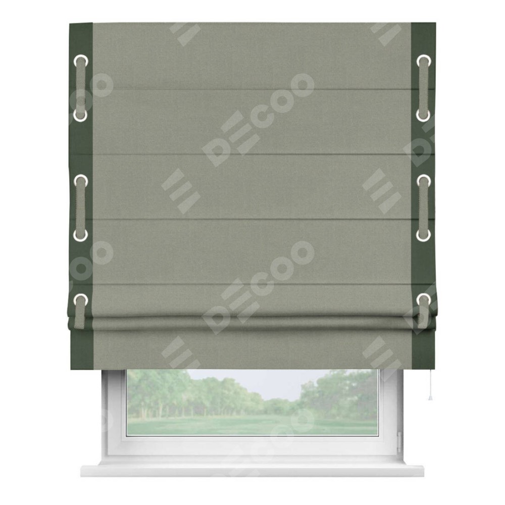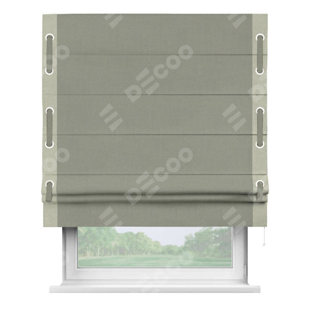 Римская штора производителя «Cortin», используется для проёма, пошита из ткани лён блэкаут светло-серый, артикул 69446. Отделка шторы кантом «Стрим Дуо» на кантах расположены люверсы с пояском, ткань для канта используется из льна разной расцветки на выбор. Ткань для пояска обычно используется из основной ткани шторы, а так же можно сделать из любой расцветки по желанию. Имеет универсальный механизм и подходит для монтажа: на потолок, на стену и в нишу.