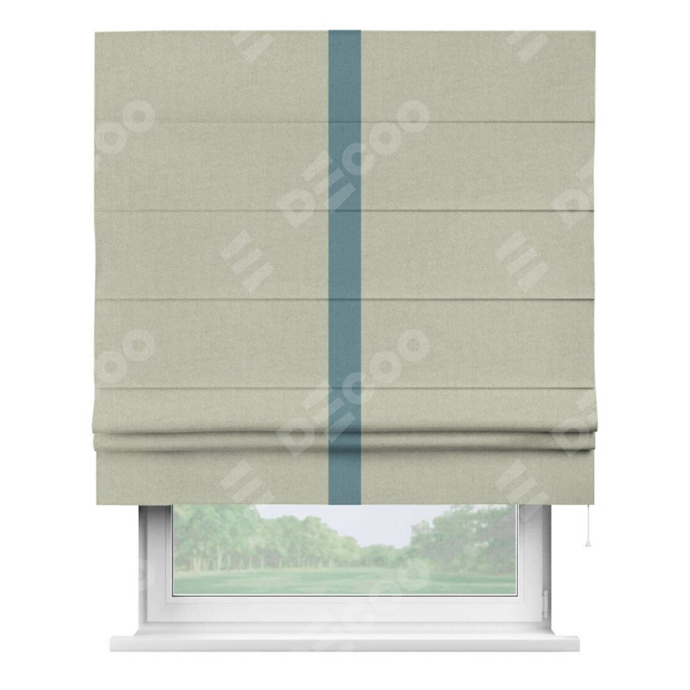 Римская штора производителя «Cortin», используется для проёма, пошита из ткани лён блэкаут серо-бежевый, артикул 69450. Отделка шторы кантом «Хайвэй», ткань для канта используется из льна разной расцветки на выбор. Имеет универсальный механизм и подходит для монтажа: на потолок, на стену и в нишу.