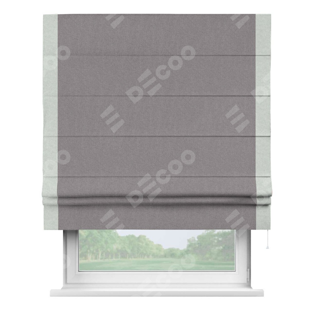 Римская штора производителя «Cortin», используется для проёма, пошита из ткани лён блэкаут сиреневый, артикул 69576. Отделка шторы кантом «Стрим Дуо», ткань для канта используется из льна разной расцветки на выбор. Имеет универсальный механизм и подходит для монтажа: на потолок, на стену и в нишу.