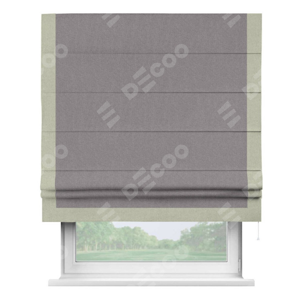 Римская штора производителя «Cortin», используется для проёма, пошита из ткани лён блэкаут сиреневый, артикул 69576. Отделка шторы кантом «Виктория», ткань для канта используется из льна разной расцветки на выбор. Имеет универсальный механизм и подходит для монтажа: на потолок, на стену и в нишу.