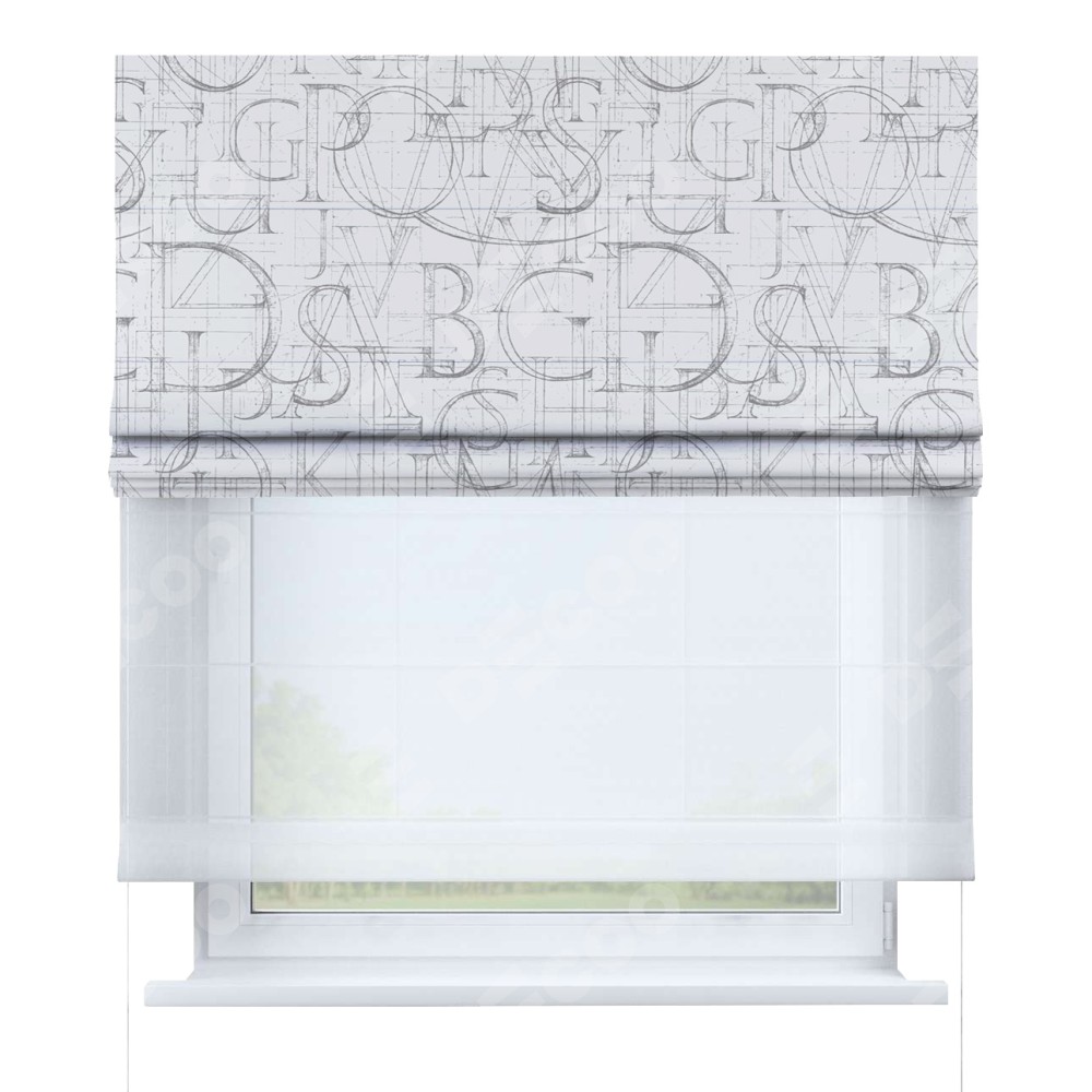 Римская штора день-ночь производителя «Cortin», используется для проёма, пошита из двух полотен, с лицевой блэкаут с нанесением сублимационной печати «Античные буквы», вторая ткань тюль (по стандарту комплектуется тюль белого цвета артикул V-01). Имеет универсальный механизм и подходит для монтажа: на потолок, на стену и в нишу.
